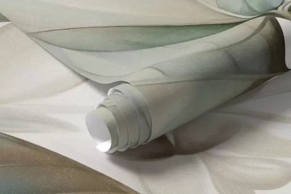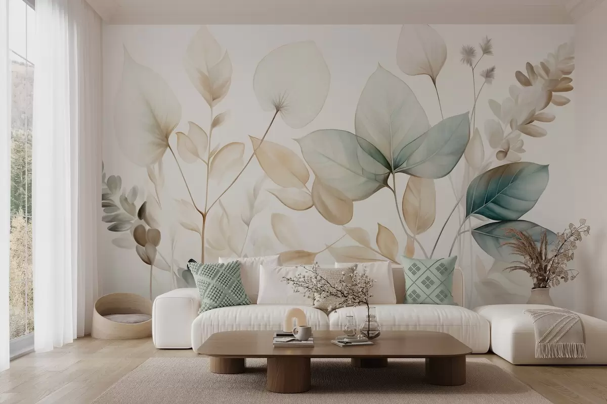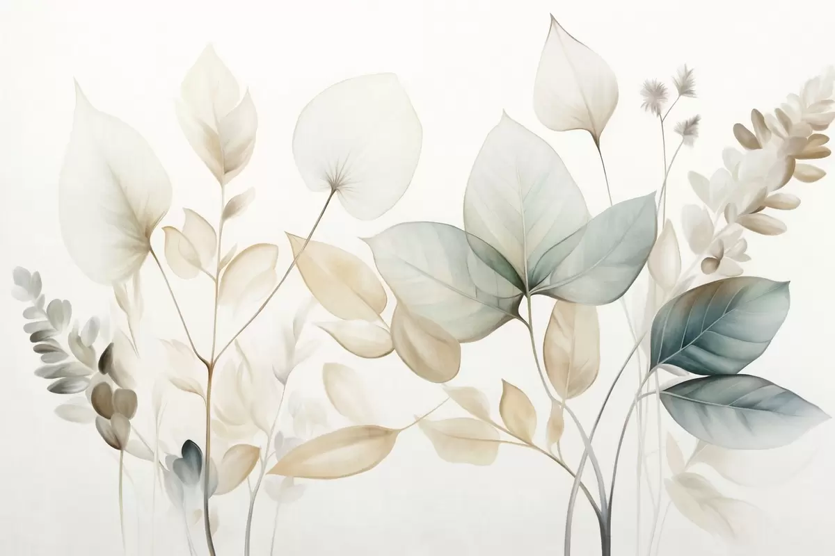 Fototapety Textúrované priehľadné listy v tlmených odtieňoch béžovej a tyrkysovej, s jemnými stonkami na jemnom, svetlom pozadí Nr. w09583