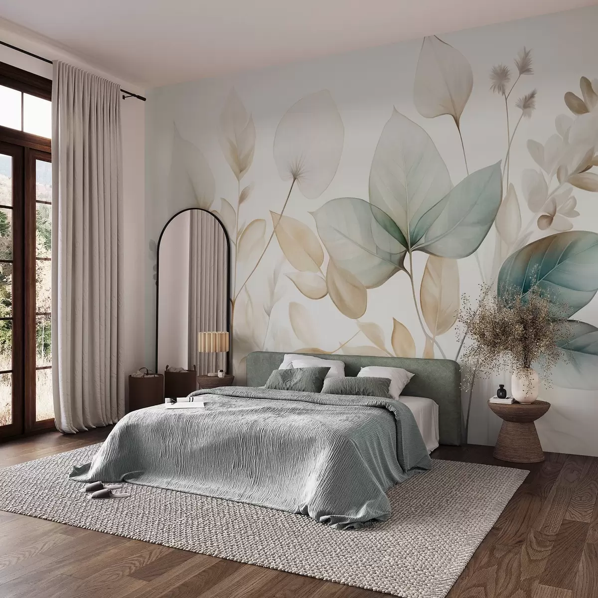 Fototapety Textúrované priehľadné listy v tlmených odtieňoch béžovej a tyrkysovej, s jemnými stonkami na jemnom, svetlom pozadí Nr. w09583