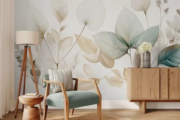 Fototapety Textúrované priehľadné listy v tlmených odtieňoch béžovej a tyrkysovej, s jemnými stonkami na jemnom, svetlom pozadí Nr. w09583