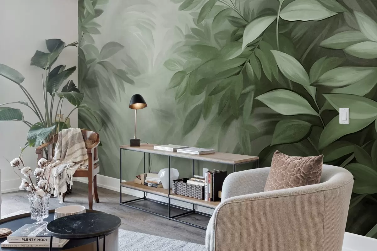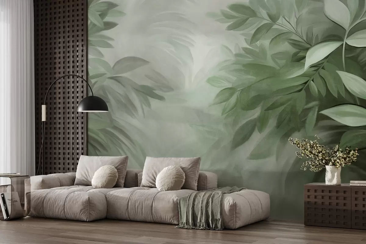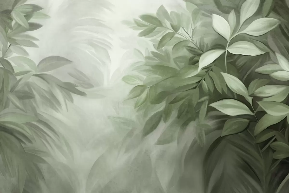 Fototapety Zelené a sivé listy s jemnou, rozmazanou textúrou, v maliarskom štýle s viditeľnými ťahmi štetcom. Nr. w09584v1