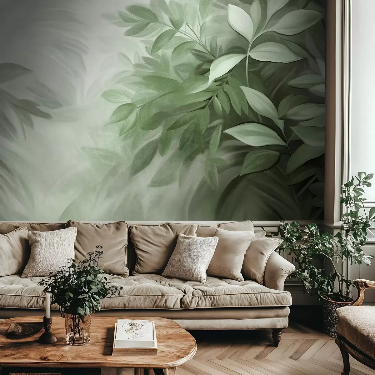 Fototapety Zelené a sivé listy s jemnou, rozmazanou textúrou, v maliarskom štýle s viditeľnými ťahmi štetcom Nr. w09584v1