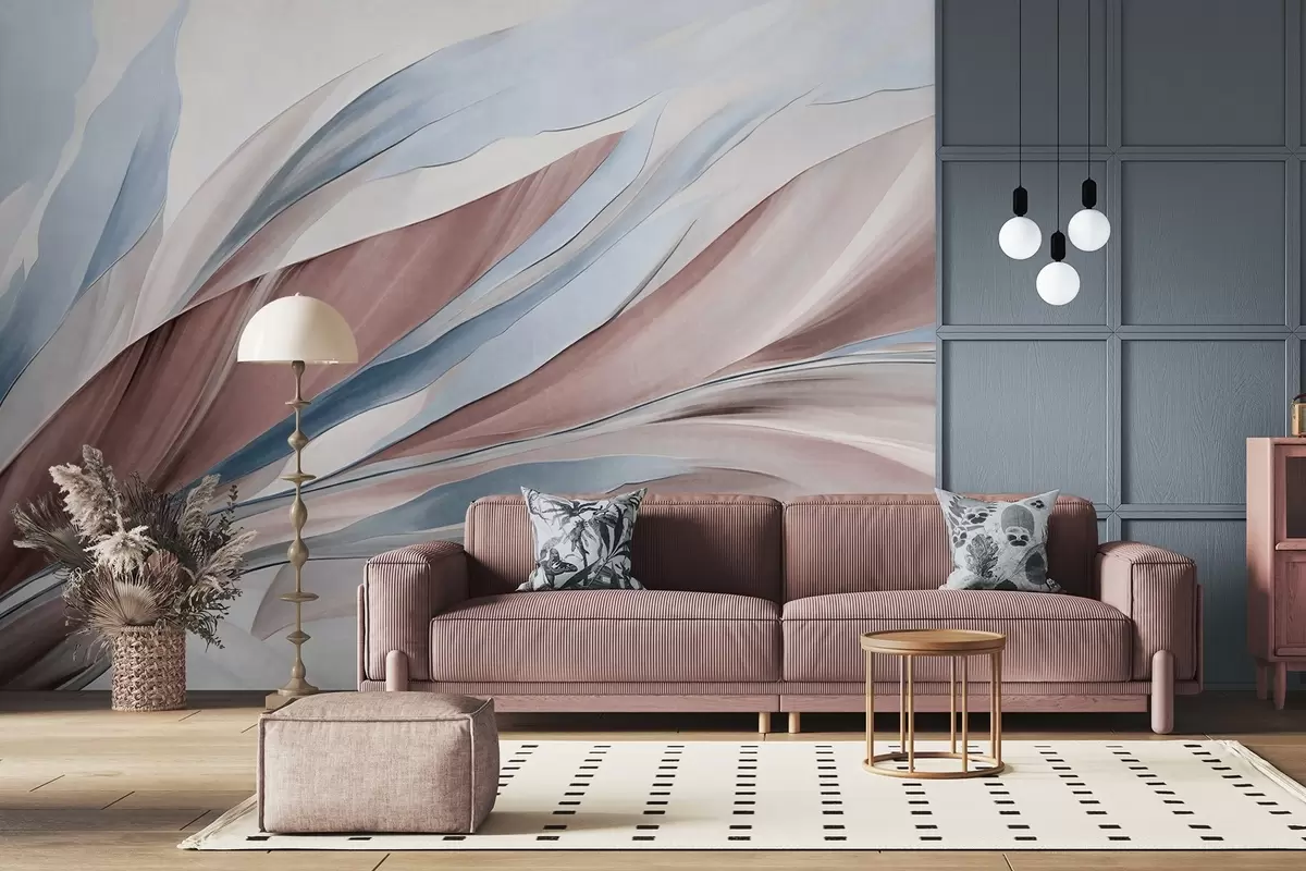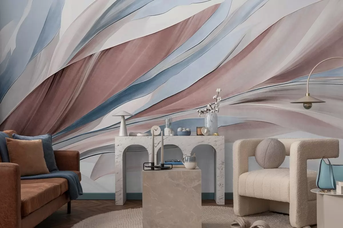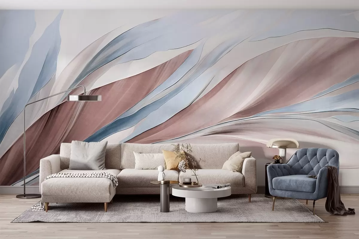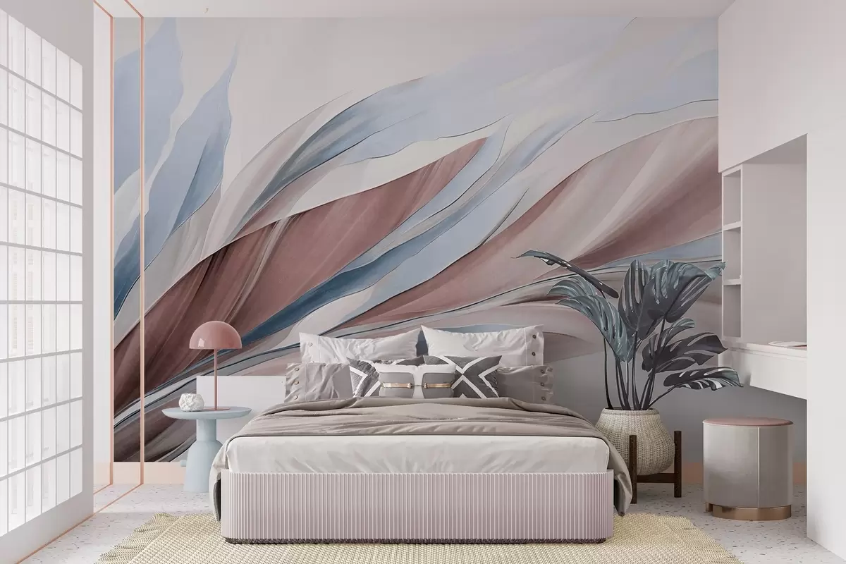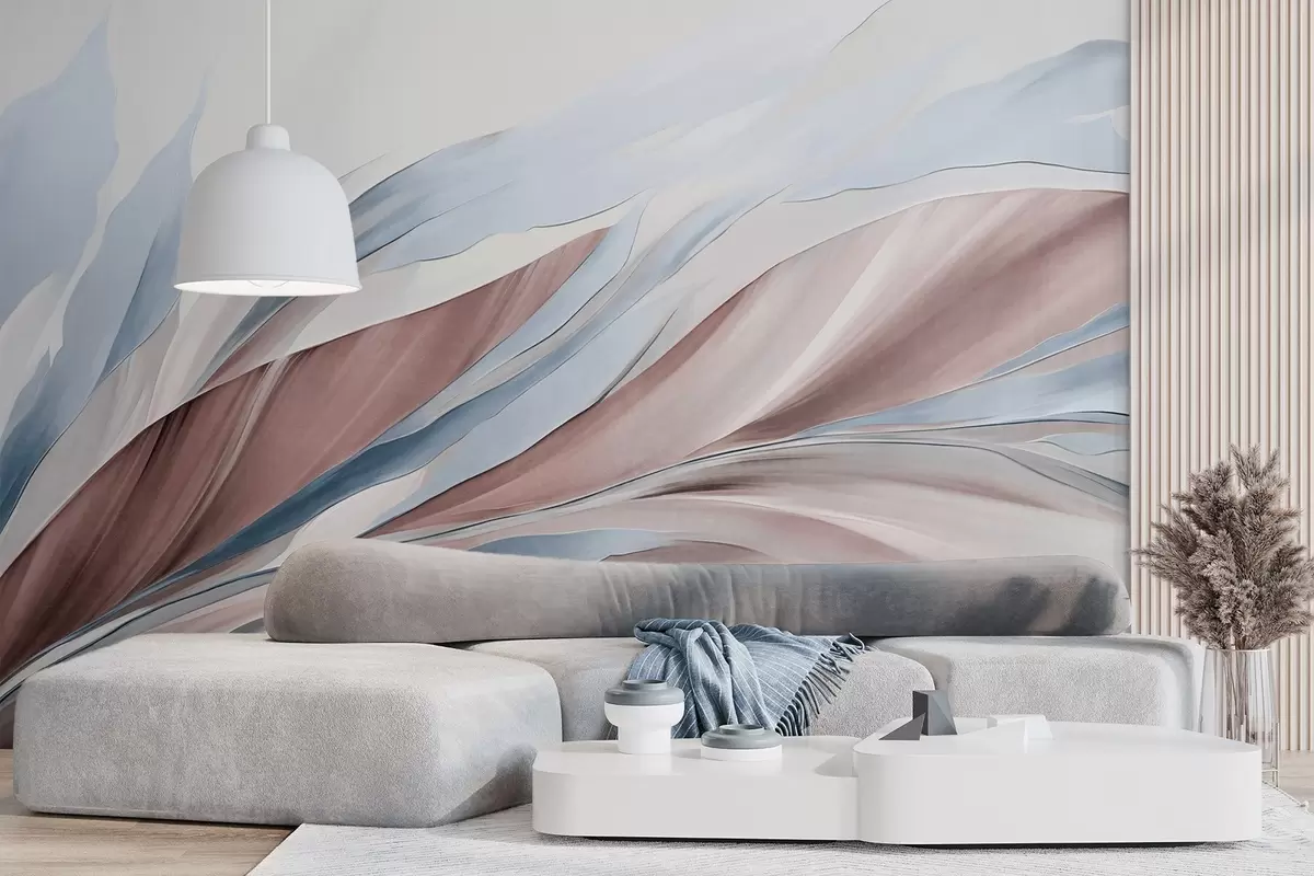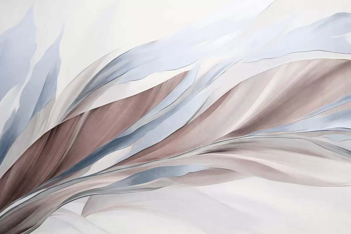 Fototapety Abstraktné vlny modrej a hnedej farby s tenkými tvarmi a líniami na bielom pozadí, textúrované umenie Nr. w09585v1
