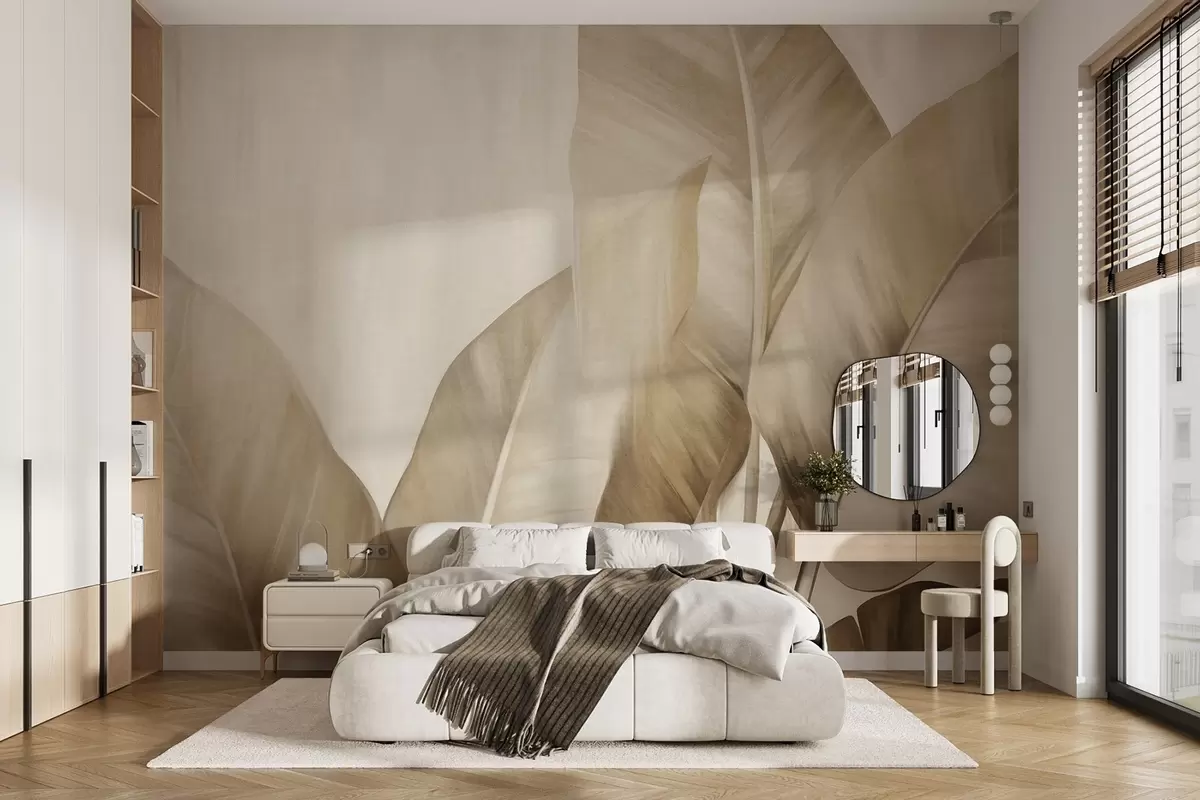 Fototapety Textúrované veľké, svetlo hnedé banánové listy na svetlo béžovom pozadí, s jemnou a minimalistickou estetikou Nr. w09586