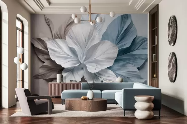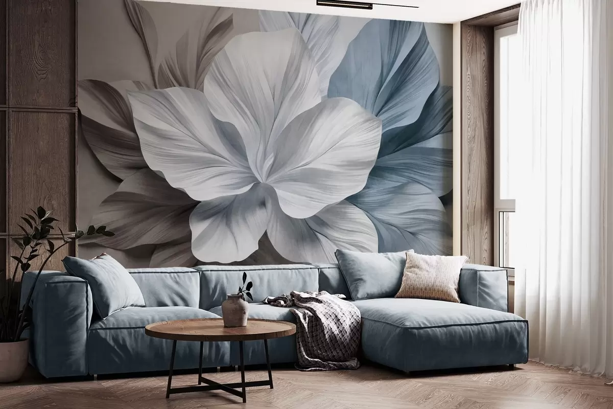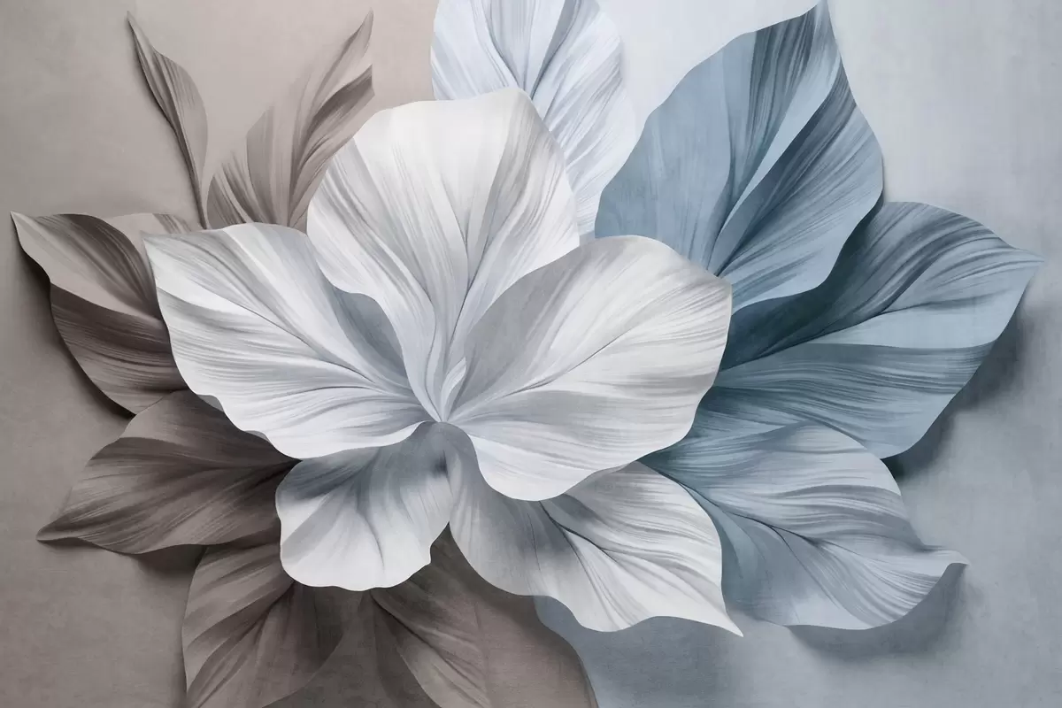 Fototapety Abstraktný kvet s viacerými okvetnými lístkami a textúrovanými listami v odtieňoch hnedej a modrej, jemné pozadie Nr. w09604v1