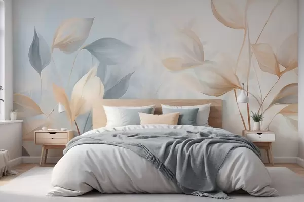 Fototapety Jemné, delikátne, priesvitné listy v tlmených odtieňoch béžovej, broskyňovej a bledomodrej, textúrované pastelové umenie Nr. w09607
