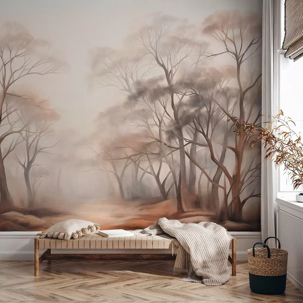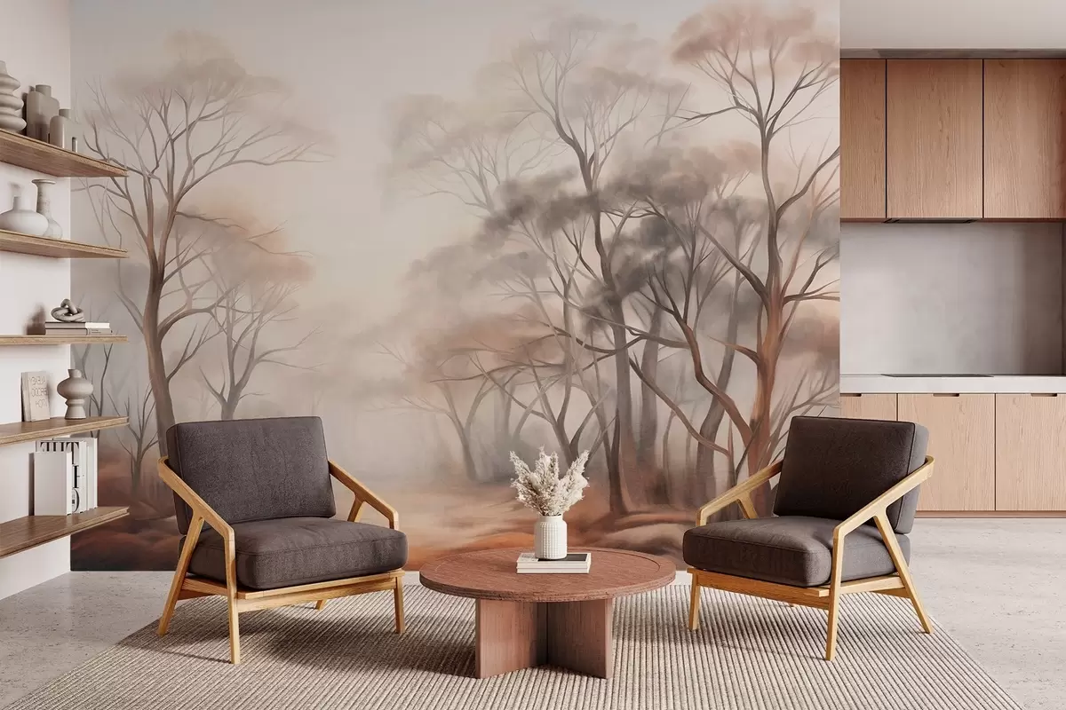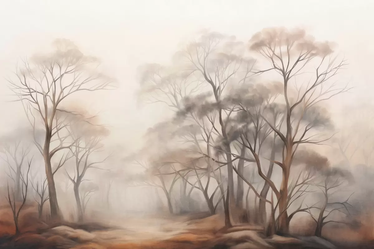 Fototapety Textúrované stromy v hmlistom lese, hmlistá krajina s tlmenými farbami a jemným osvetlením Nr. w09609