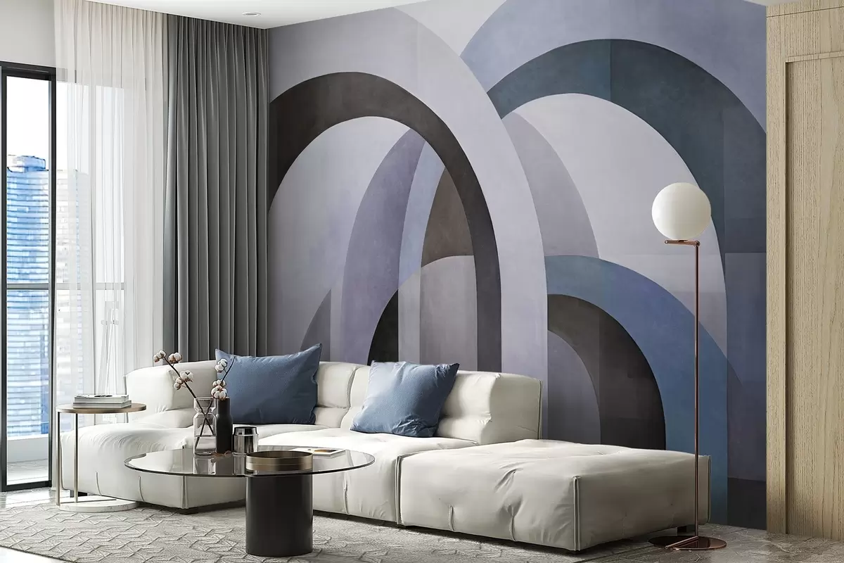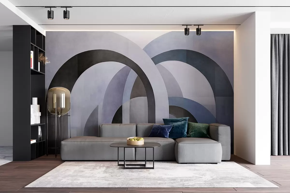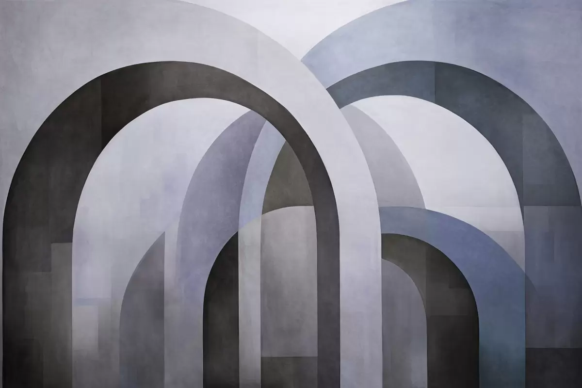 Fototapety Abstraktné textúrované geometrické oblúky v odtieňoch modrej, čiernej a sivej, vrstvený moderný architektonický dizajn Nr. w09611v1