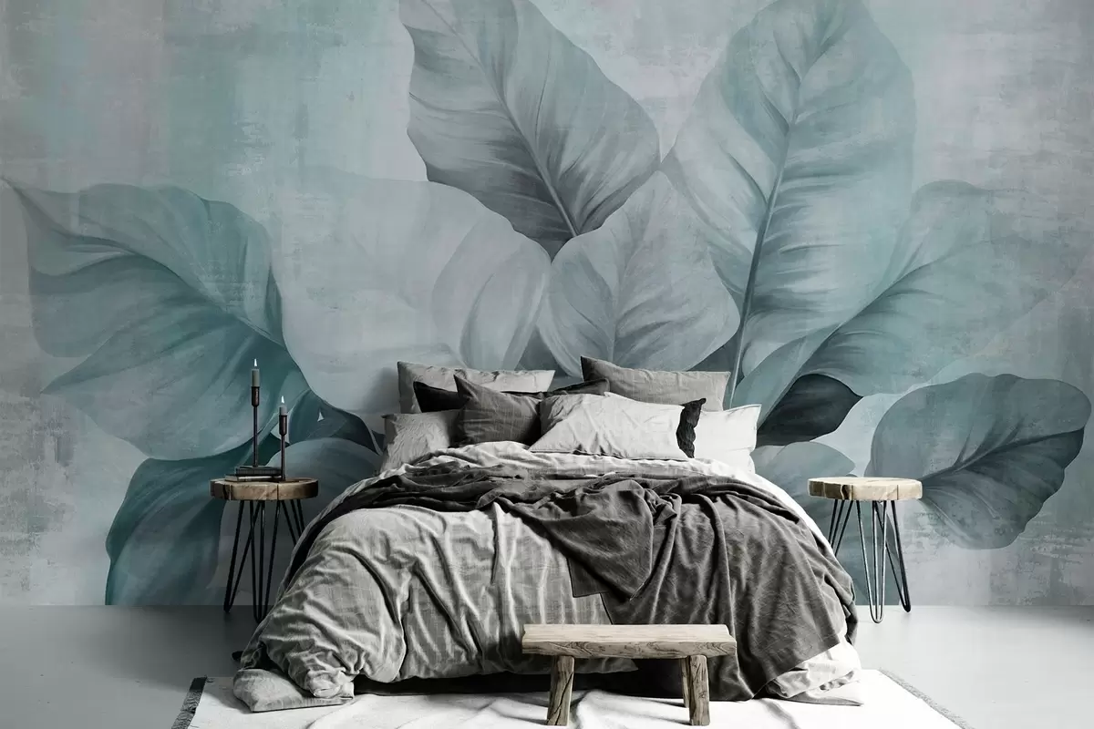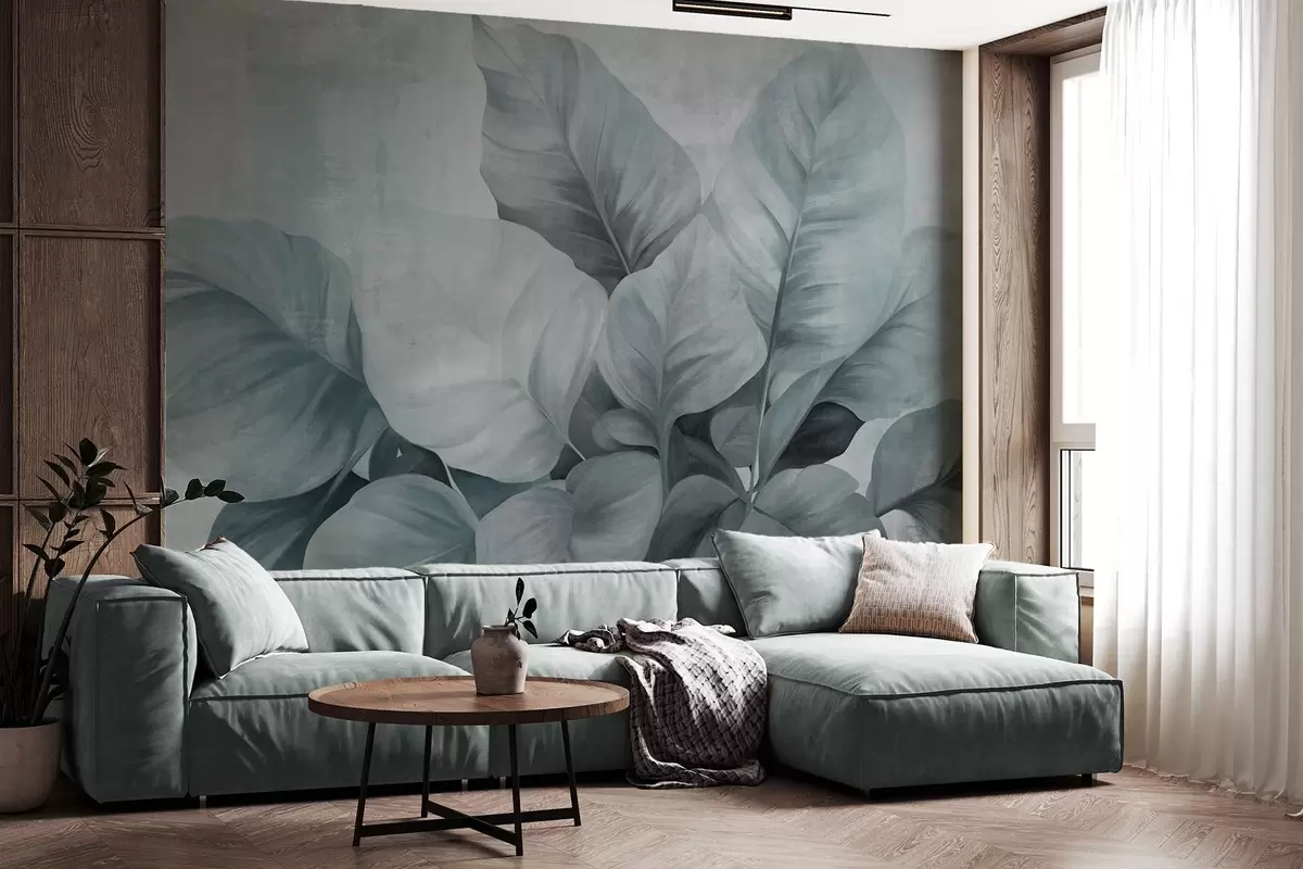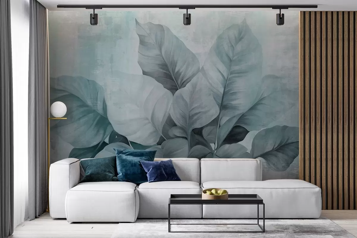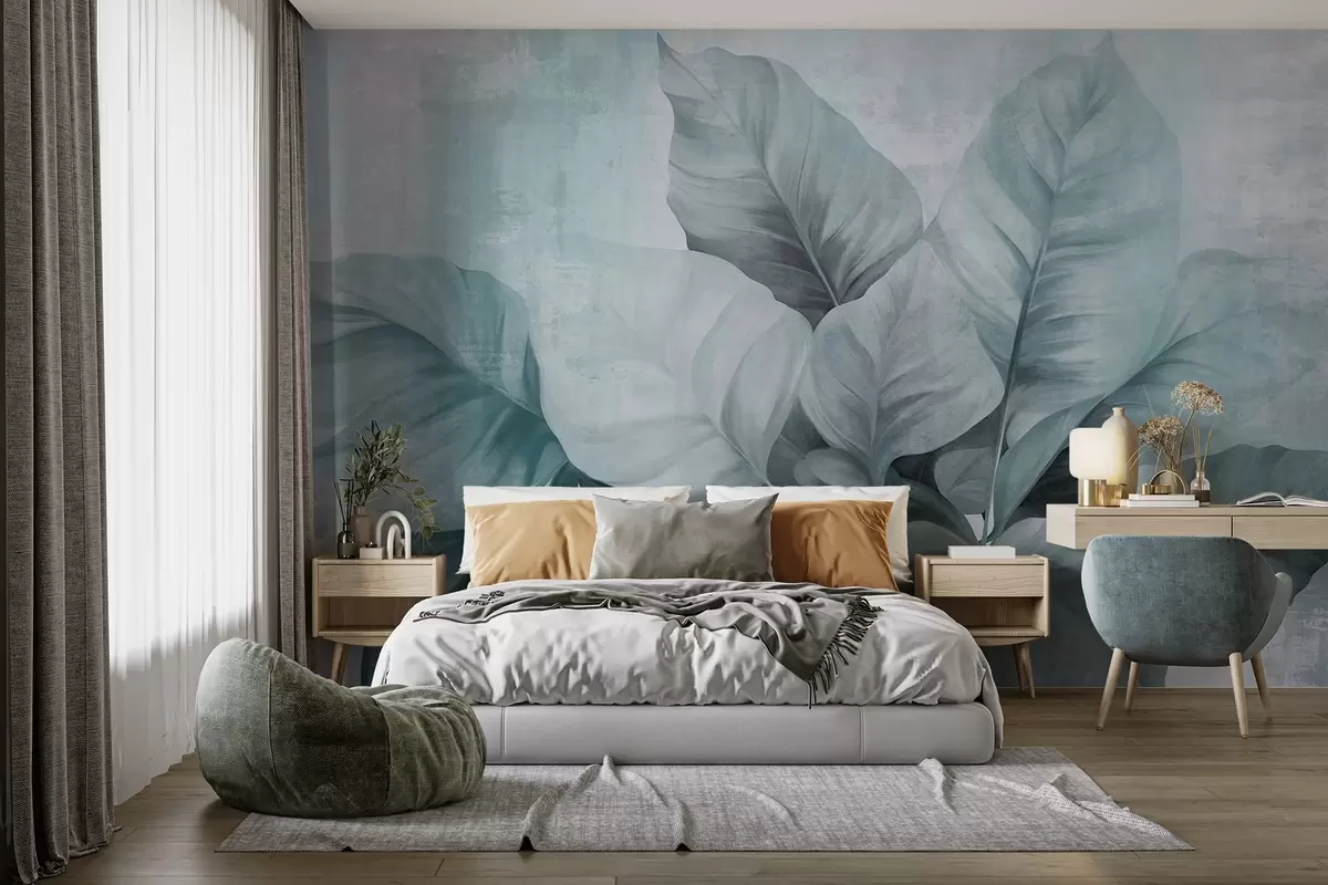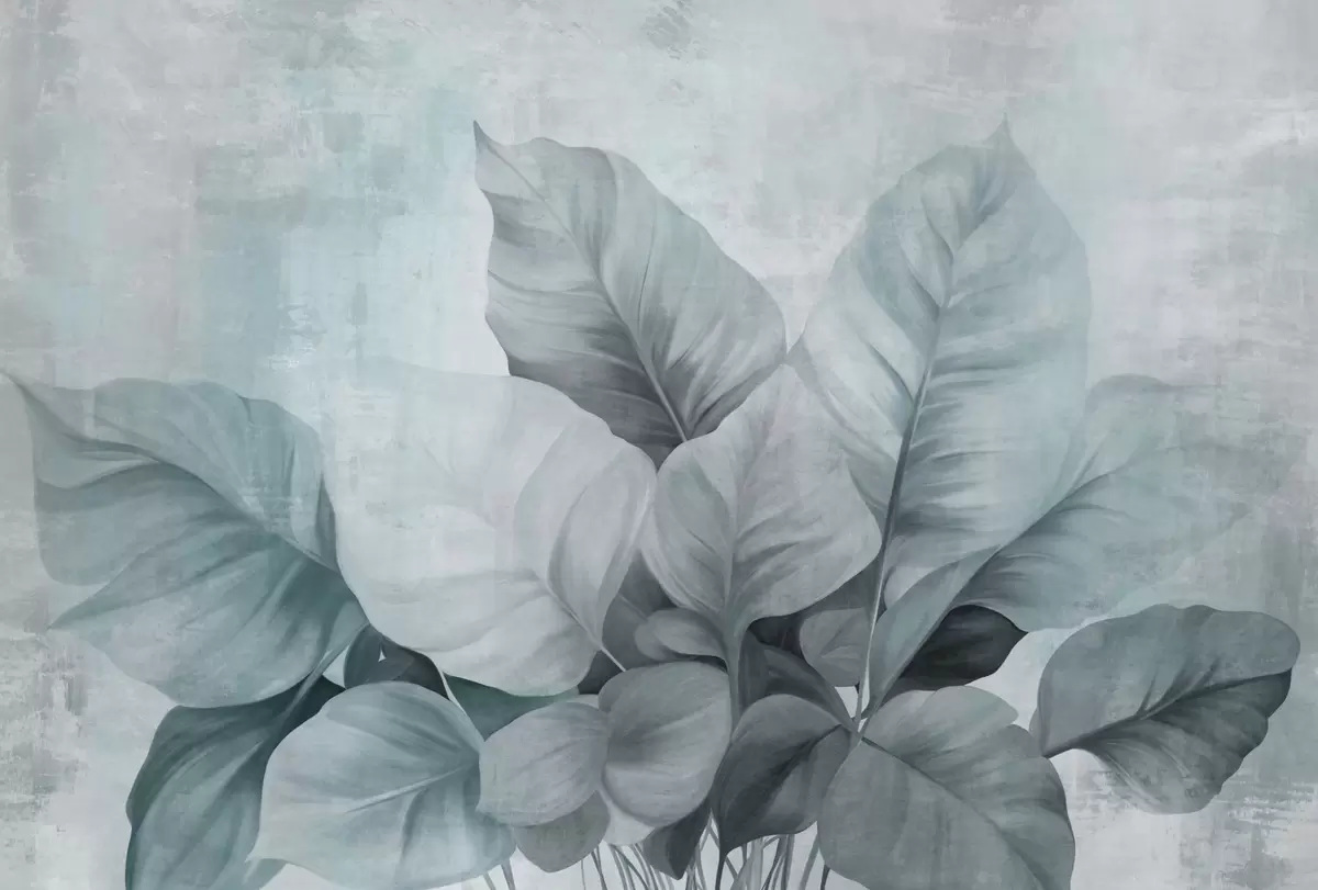 Fototapety Textúrovaná maľba imitujúca veľké, svetlo modré listy na neutrálnom pozadí s jemnými ťahmi štetcom. Nr. w09614v2