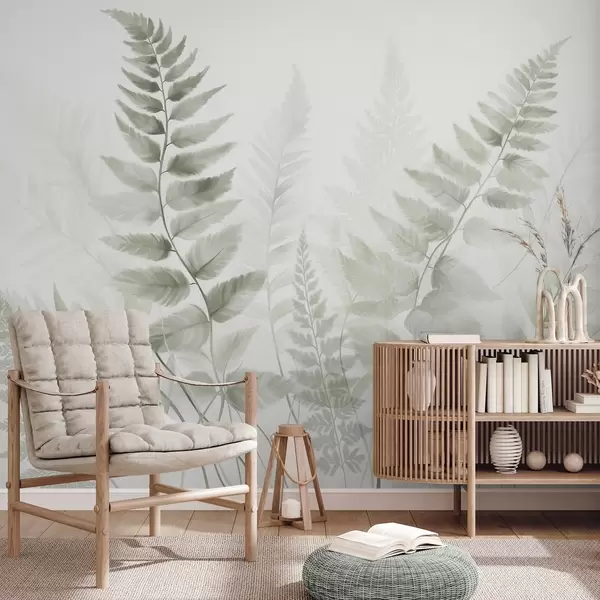 Fototapety Textúrované sušené listy paprade v rôznych odtieňoch zelenej farby s jemným, svetlým pozadím v akvarelovom štýle. Nr. w09615v1