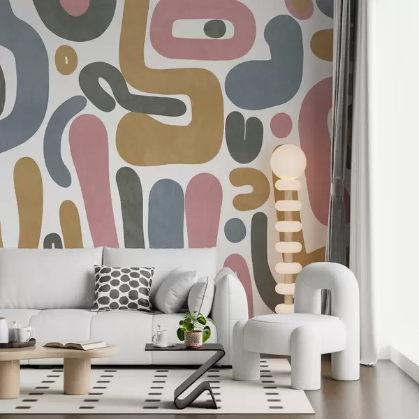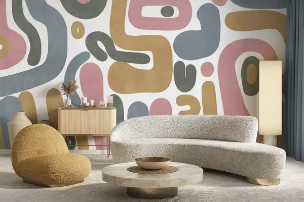 Fototapety Abstraktné textúrované tvary v pastelovo ružovej, tlmenou modrej, horčicovo žltej a sivej farbe na bielom pozadí moderné umenie Nr. w09620