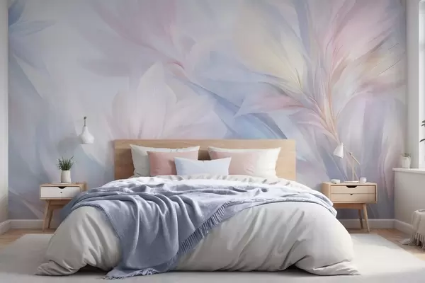 Fototapety Mäkké, pastelové listy a pierka v odtieňoch ružovej, modrej a žltej, abstraktná a textúrovaná potlač Nr. w09634