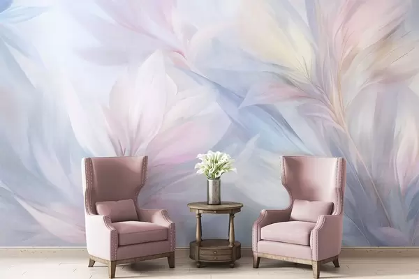 Fototapety Mäkké, pastelové listy a pierka v odtieňoch ružovej, modrej a žltej, abstraktná a textúrovaná potlač Nr. w09634