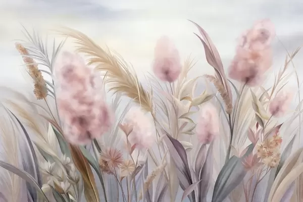 Fototapety Ružová a béžová tráva pampas a ďalšie sušené kvety s jemnou, zamračenou oblohou v pozadí Nr. w09635