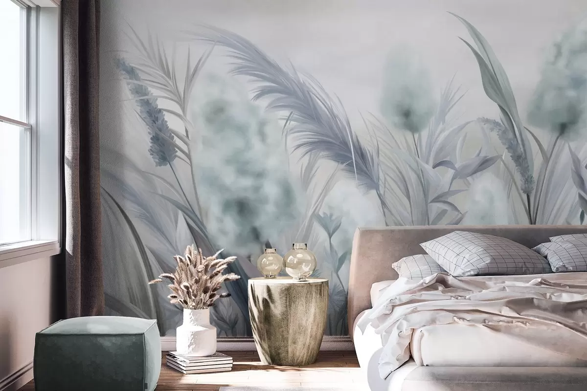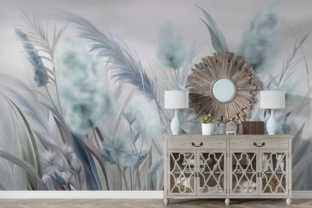 Fototapety Modrá a sivá tráva pampas a iné sušené kvety s jemnou, zamračenou oblohou v pozadí Nr. w09635v1