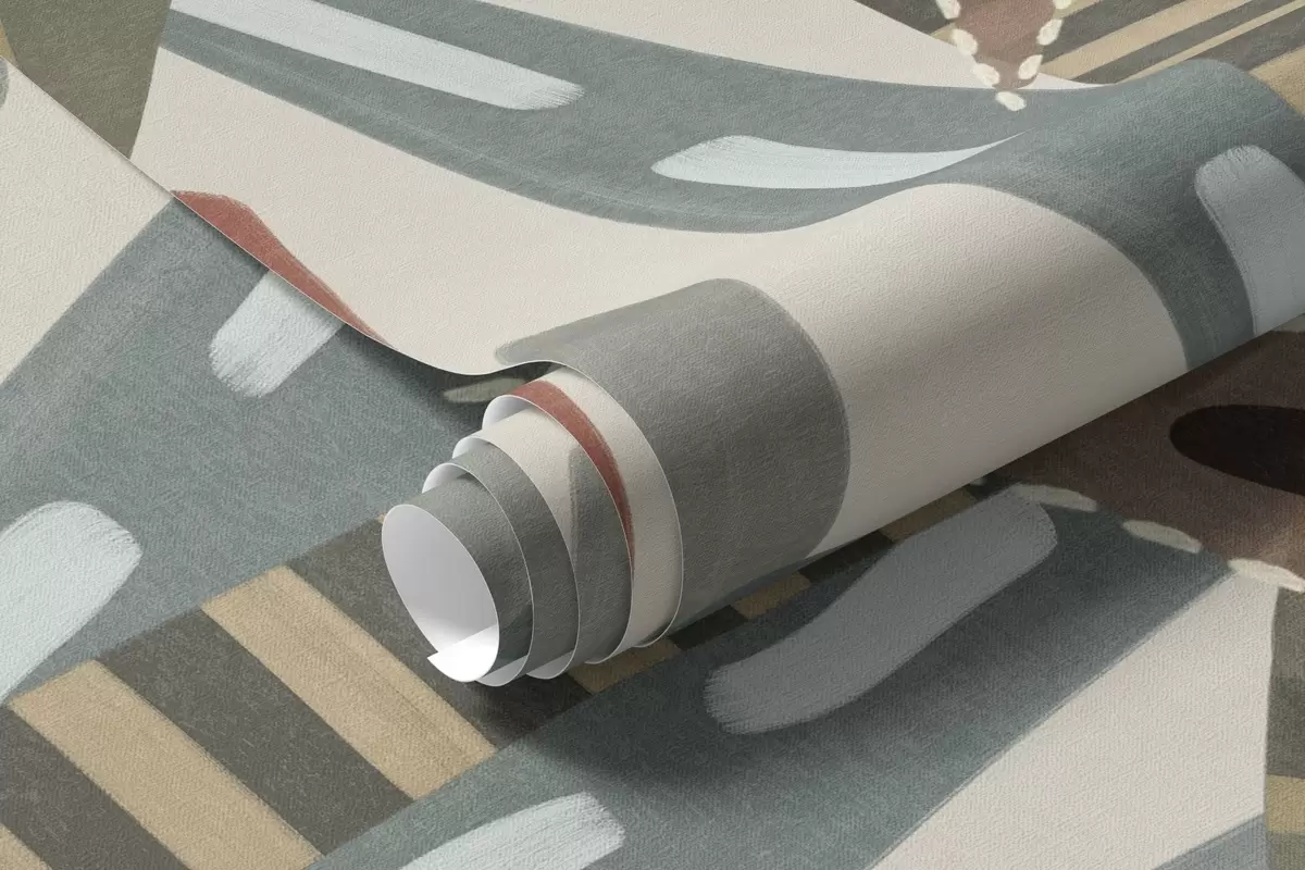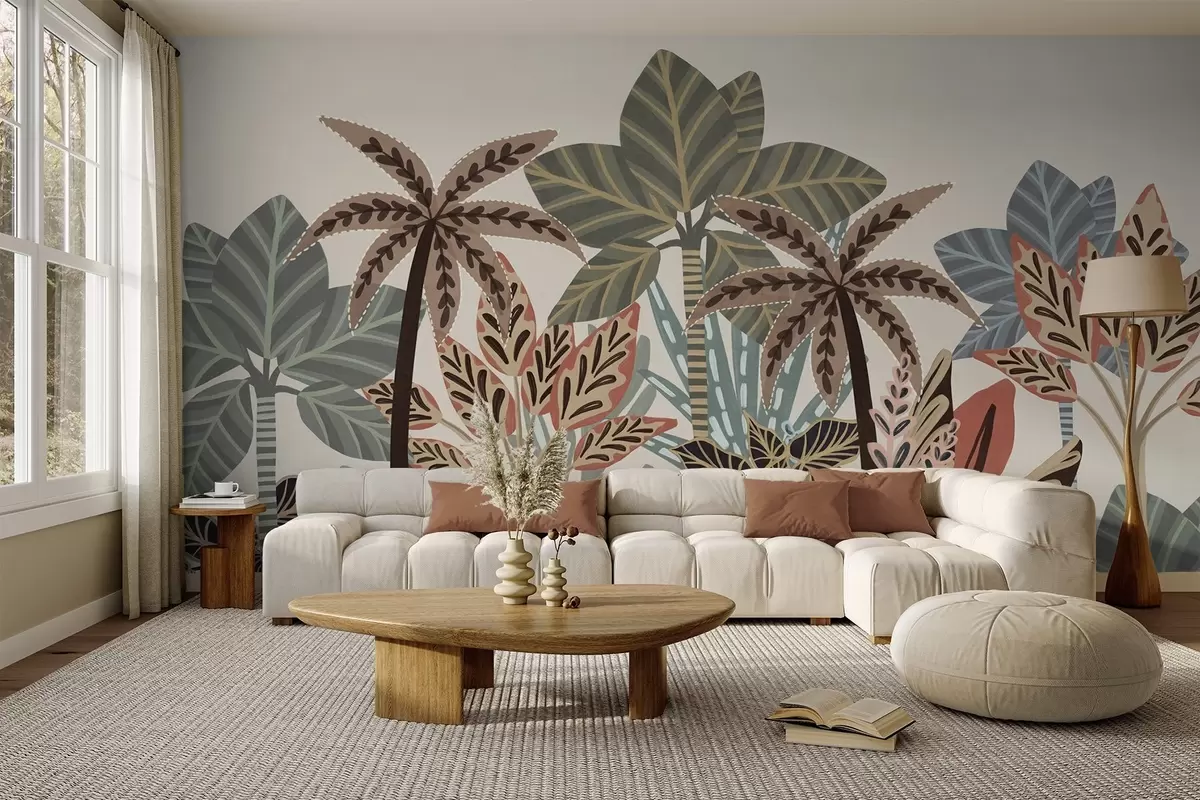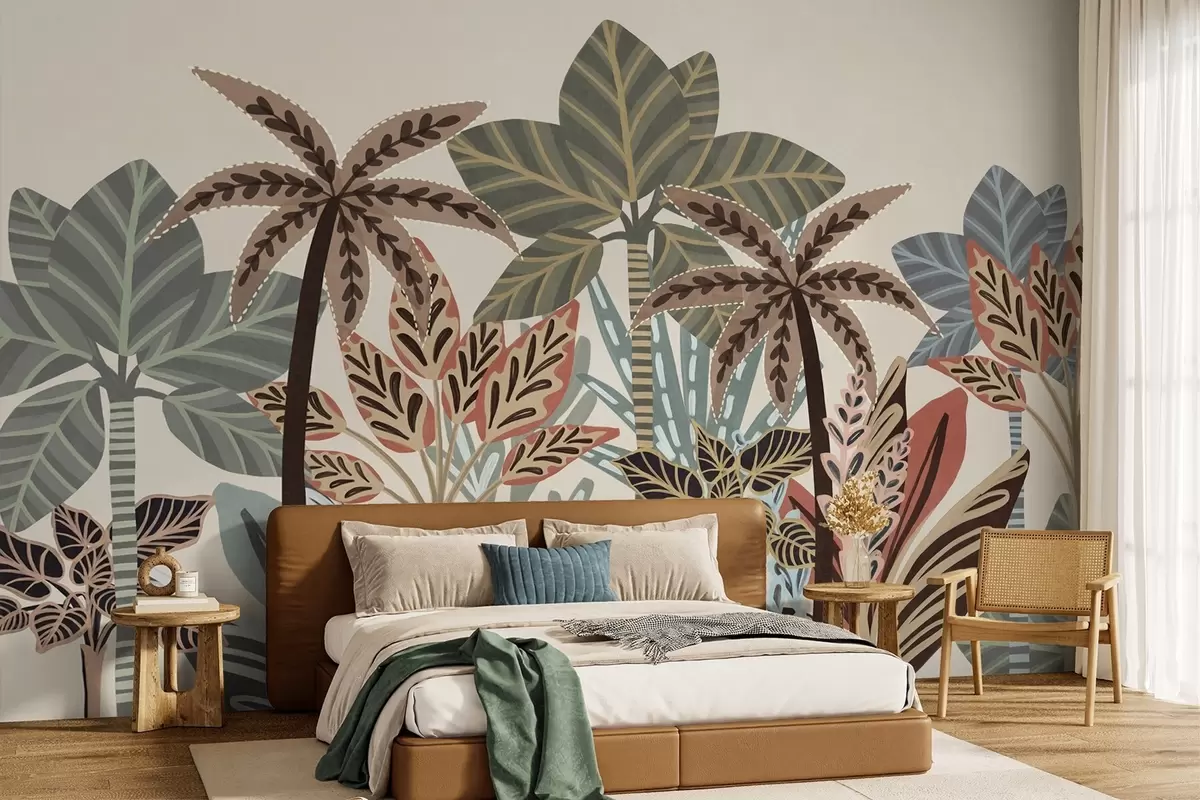 Fototapety Textúrované tropické rastliny a palmy v tlmených farbách v dekoratívnom štýle boho na smotanovom pozadí Nr. w09639