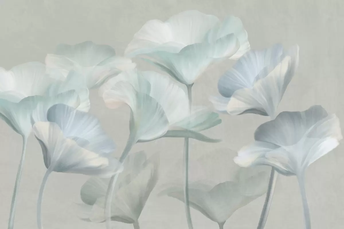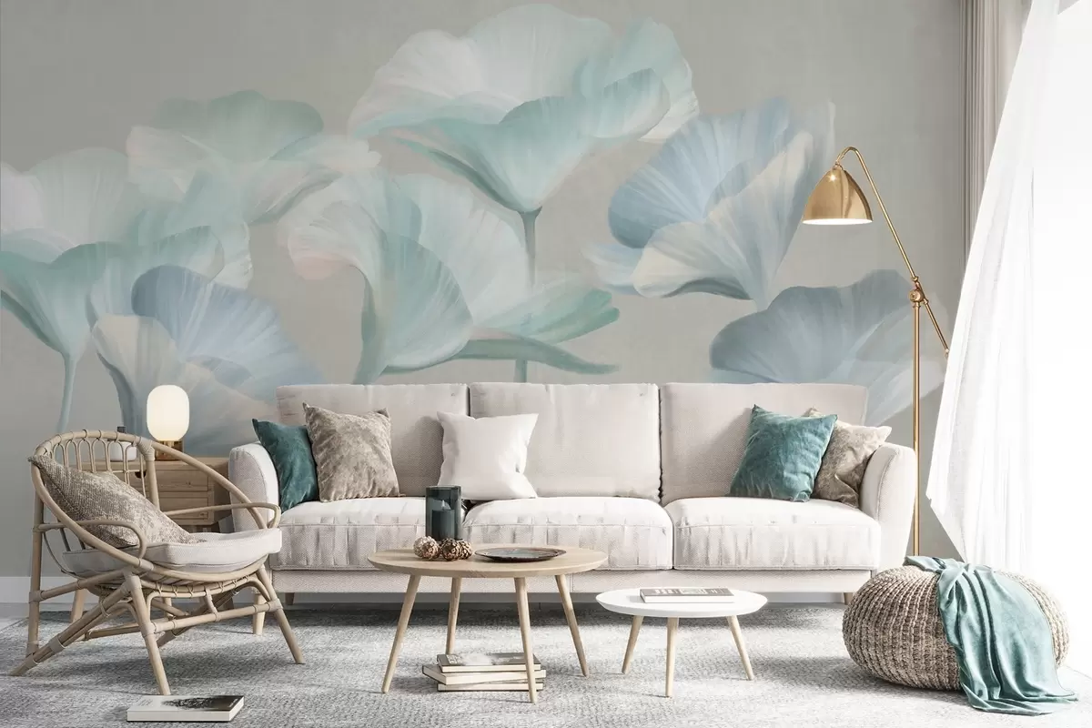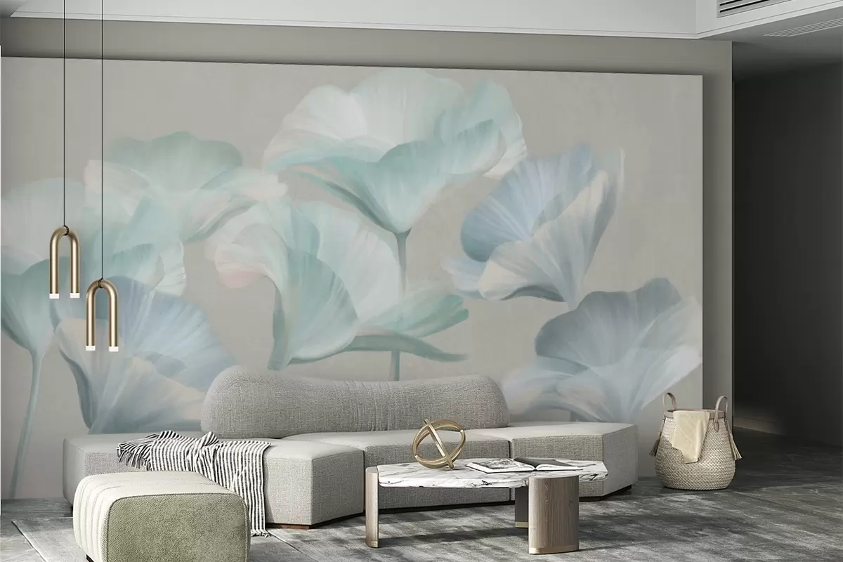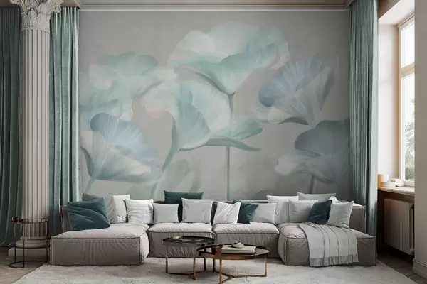 Fototapety Svetlo tyrkysové priehľadné kvety lotosu s jemnými okvetnými lístkami na tlmenom sivom pozadí Nr. w09640v2