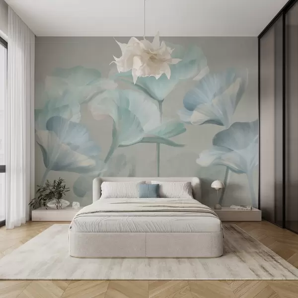 Fototapety Svetlo tyrkysové priehľadné kvety lotosu s jemnými okvetnými lístkami na tlmenom sivom pozadí Nr. w09640v2