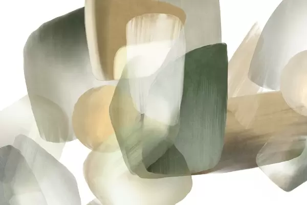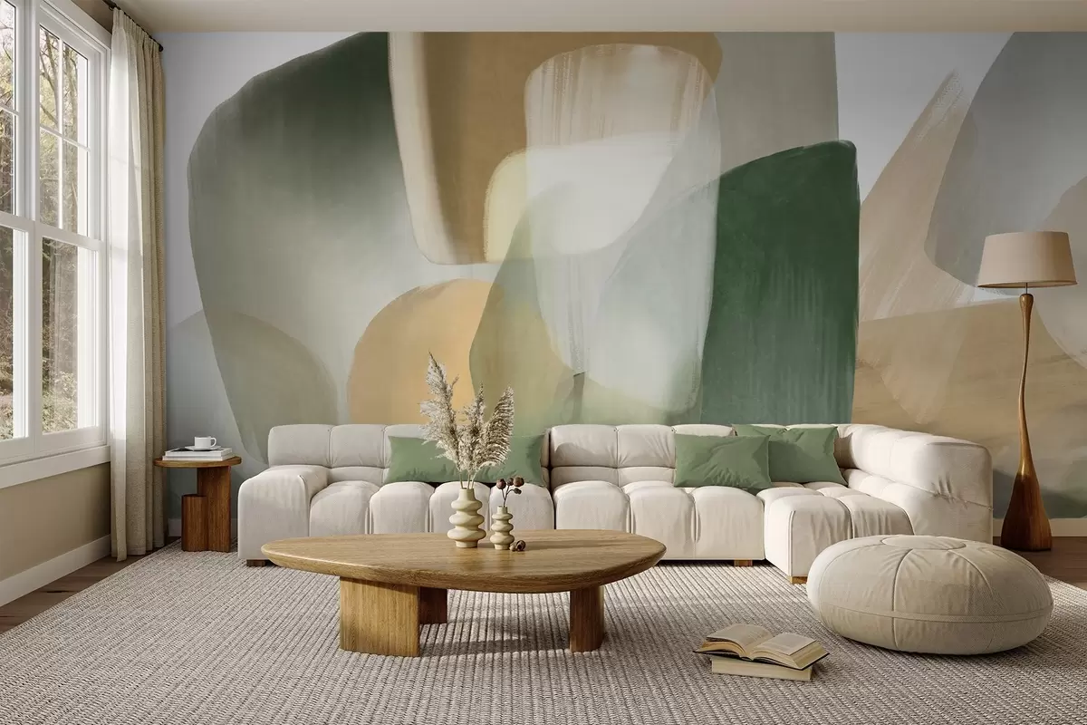 Fototapety Abstraktné textúrované tvary v tlmených zelených a béžových farbách, s jemnými okrajmi a prekrývajúcimi sa vrstvami Nr. w09642