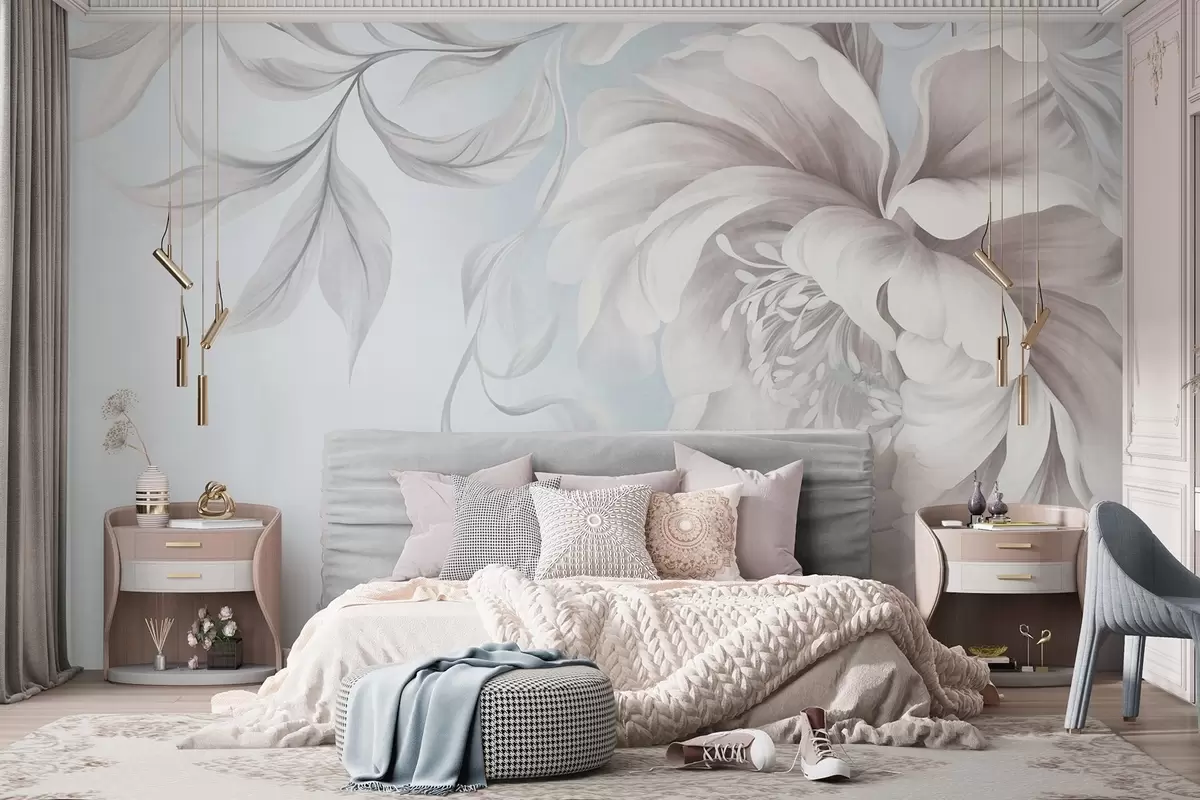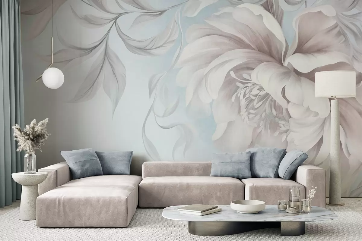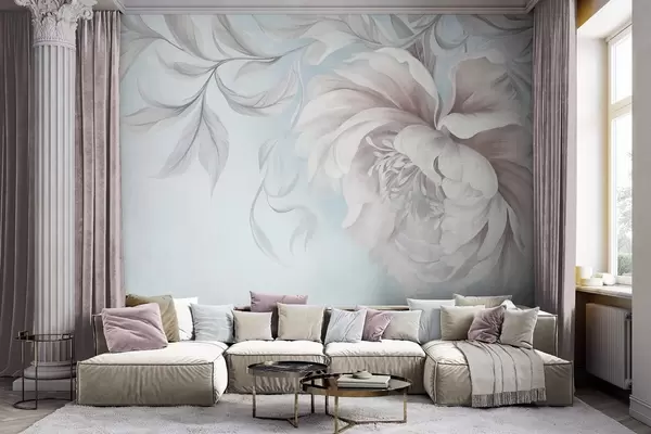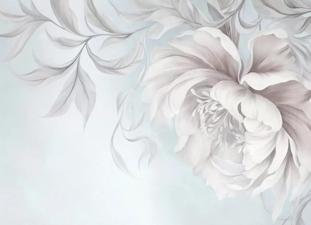 Fototapety Veľká pivoňka so štruktúrovanými okvetnými lístkami a sivými listami, namaľovaná v jemnom štýle Nr. w09647v1