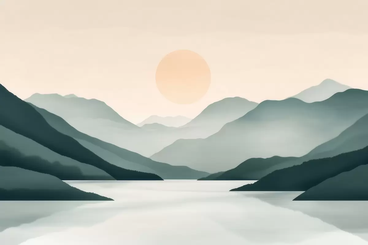 Fototapety Pokojná horská krajina so slnkom nad jazerom Nr. w09735