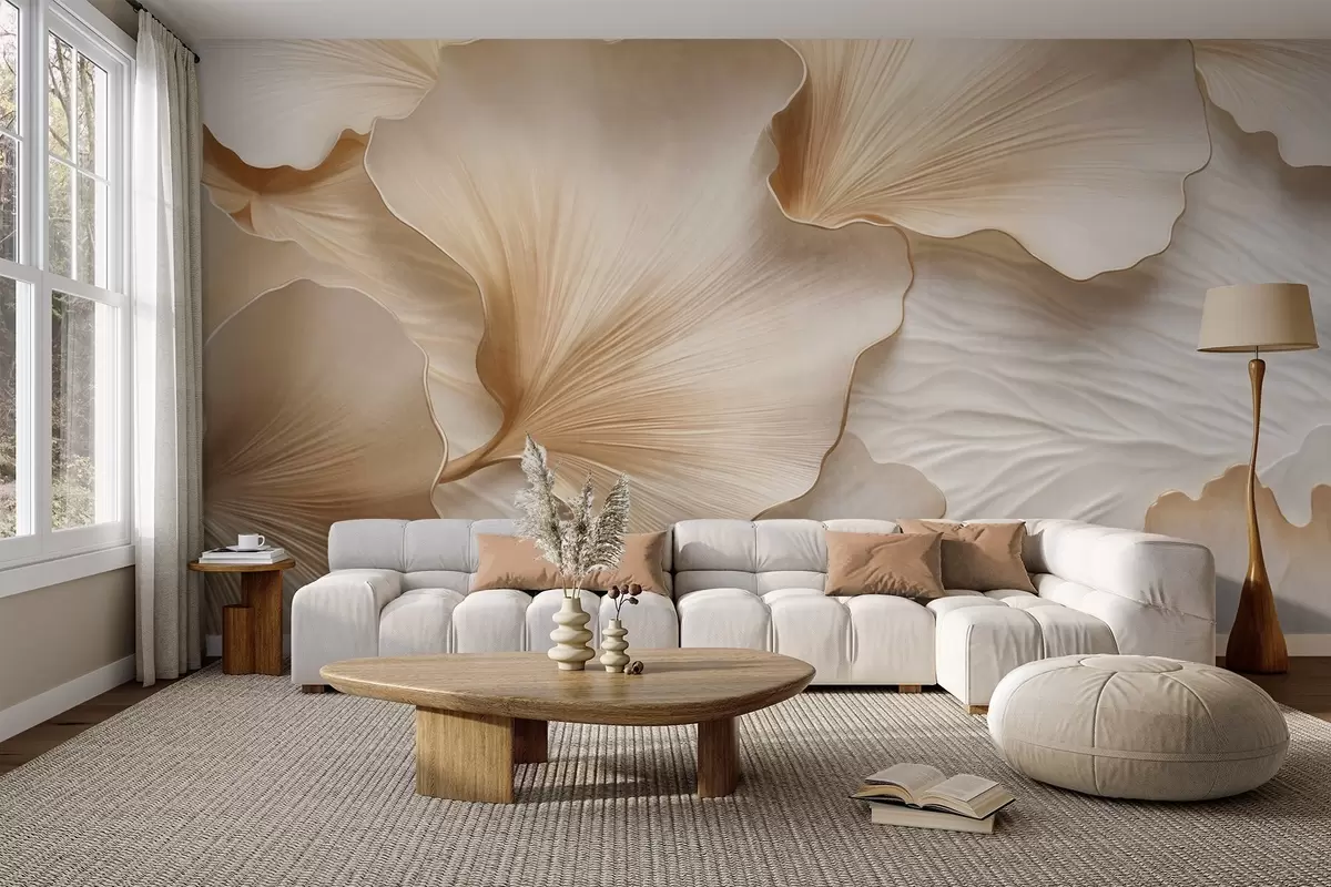 Fototapety Textúrované, béžové a biele okvetné lístky ginkga s jemným organickým potlačou Nr. w09741