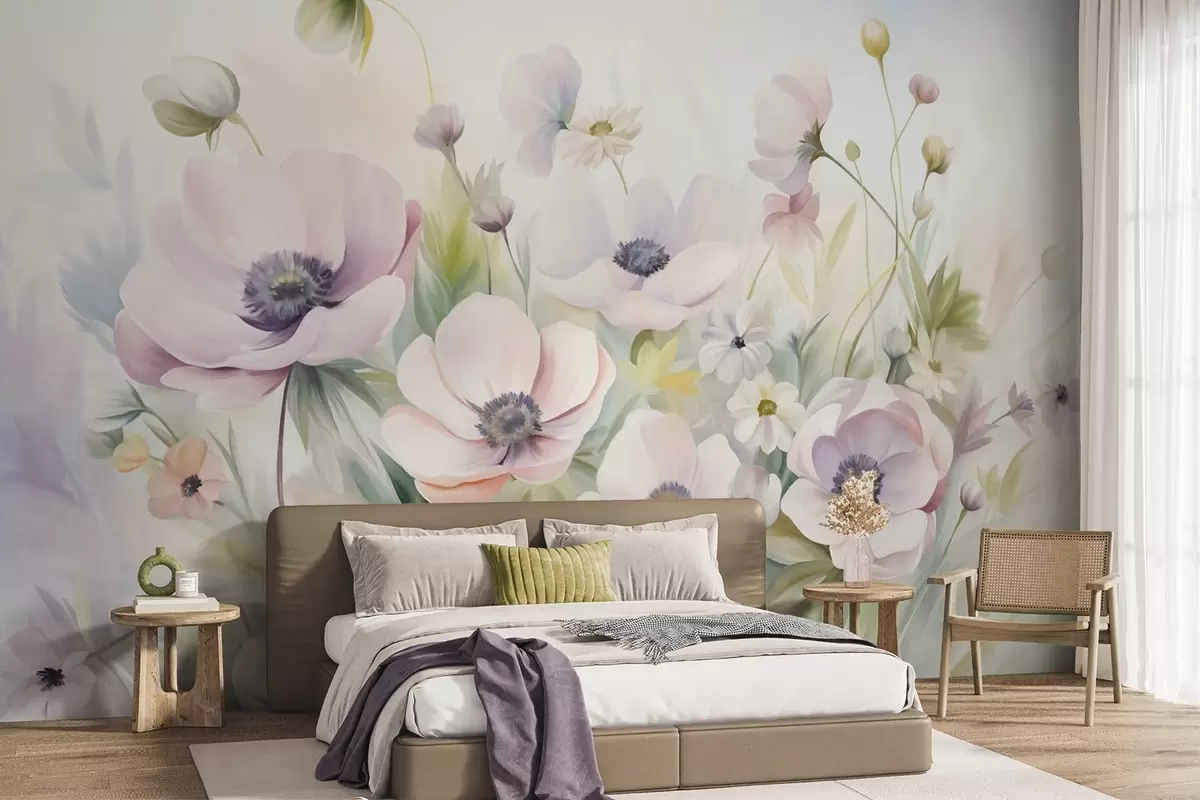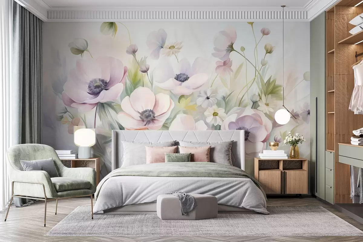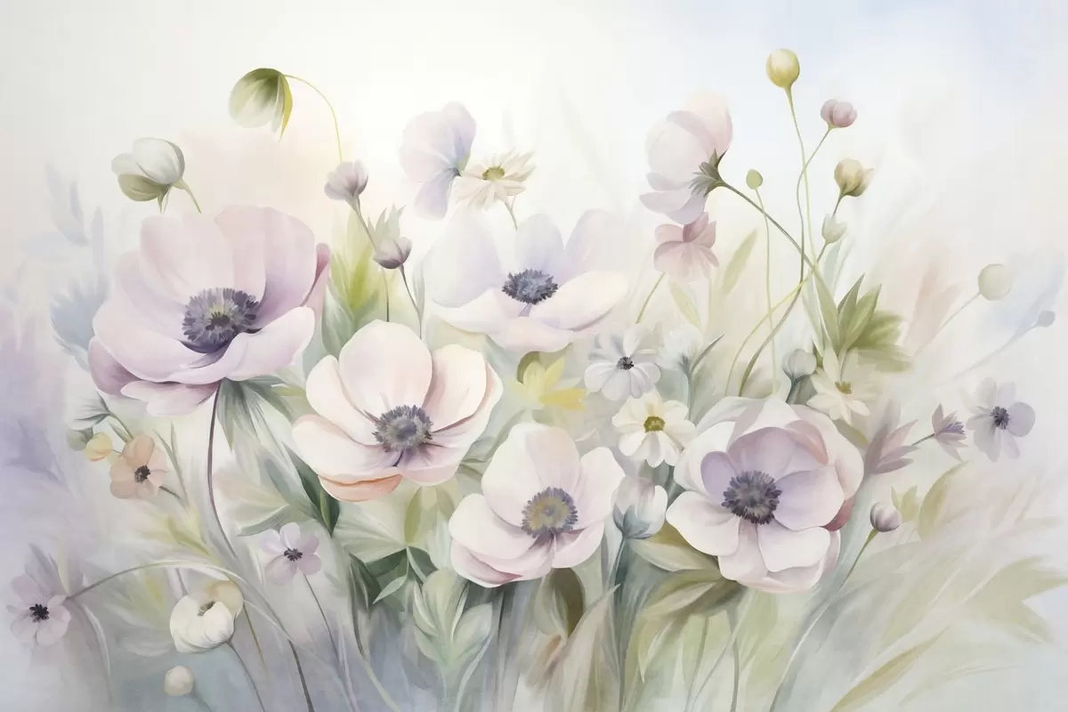 Fototapety Pole pastelovo ružových a bielych kvetov anemón, zelené lístie a malé biele sedmokrásky Nr. w09742