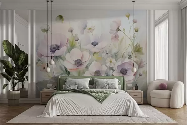 Fototapety Pole pastelovo ružových a bielych kvetov anemón, zelené lístie a malé biele sedmokrásky Nr. w09742