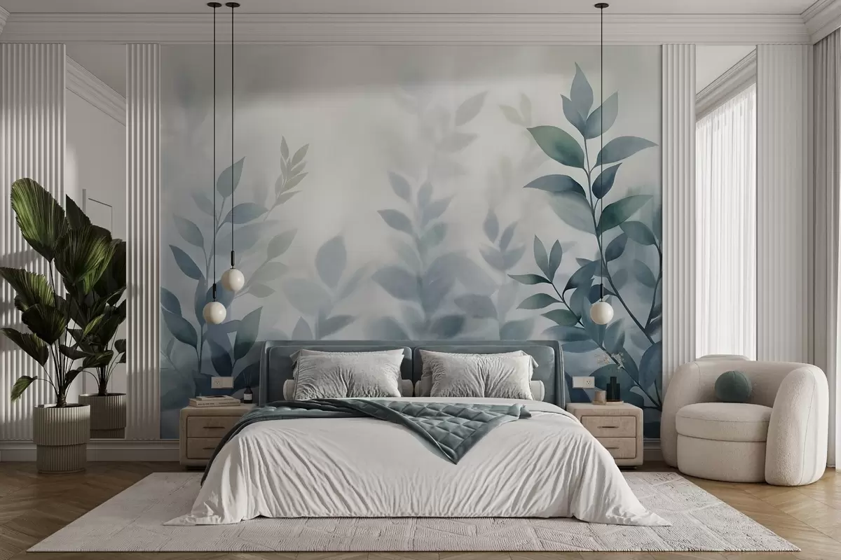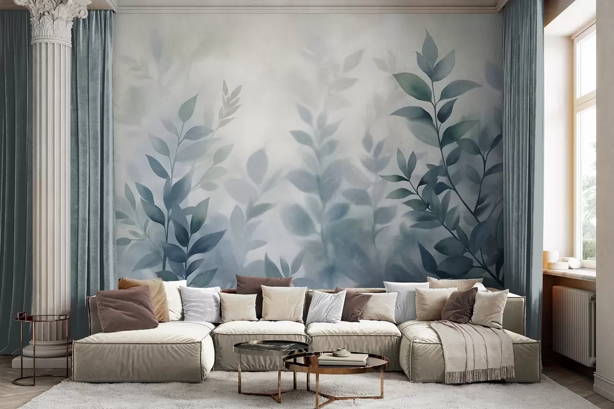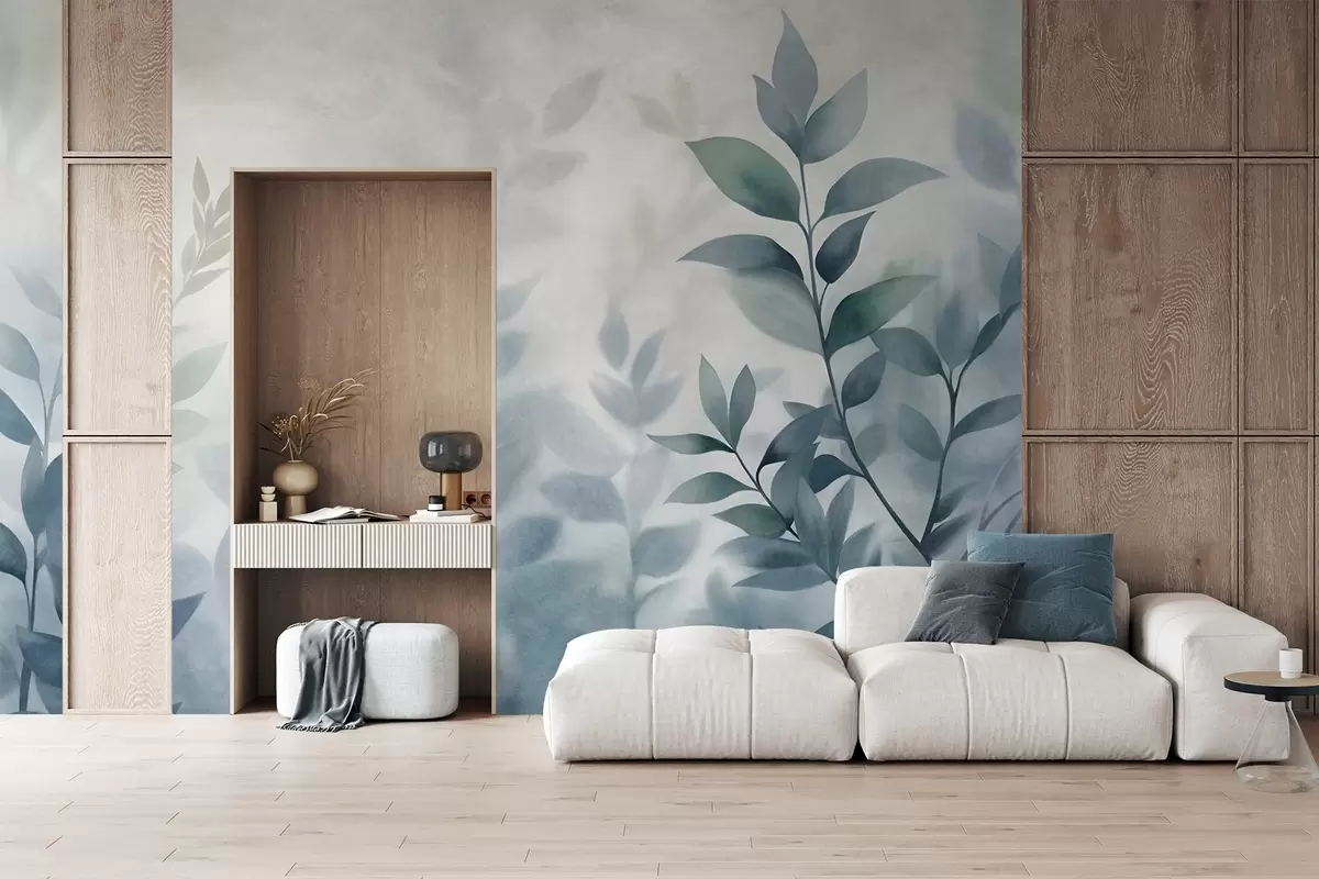 Fototapety Jemné vetvy s tlmenými modrými listami, štýl akvarelovej maľby, textúrované umenie Nr. w09750v1
