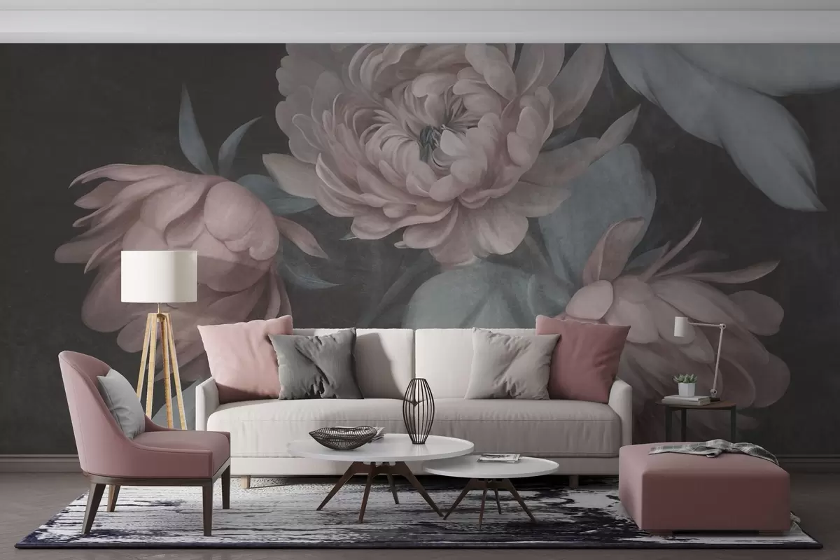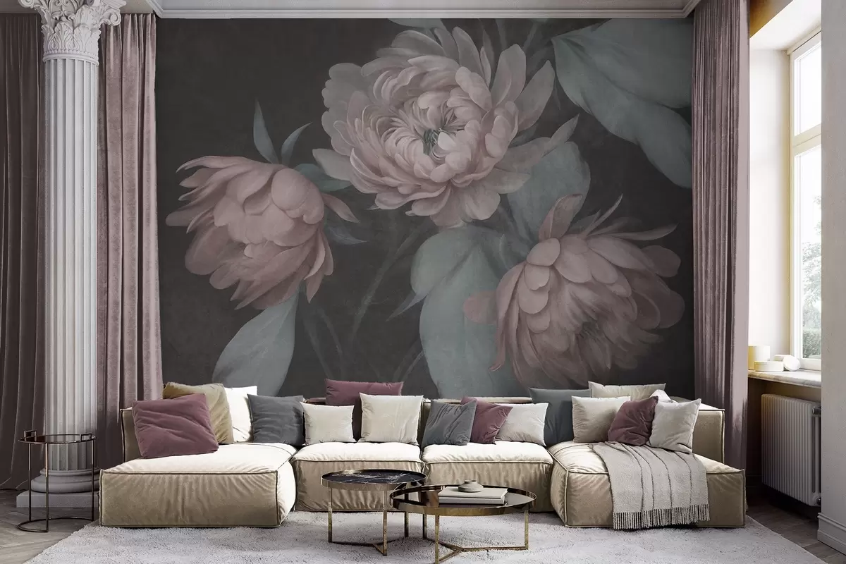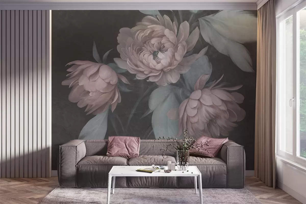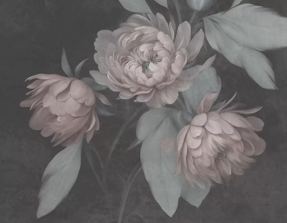 Fototapety Textúrované svetloružové kvety pivonky s jemne zelenými listami na tmavom pozadí Nr. w09751v1