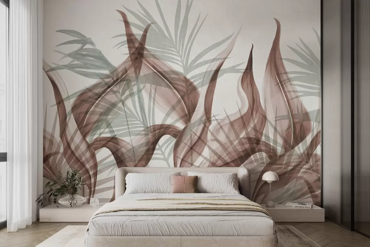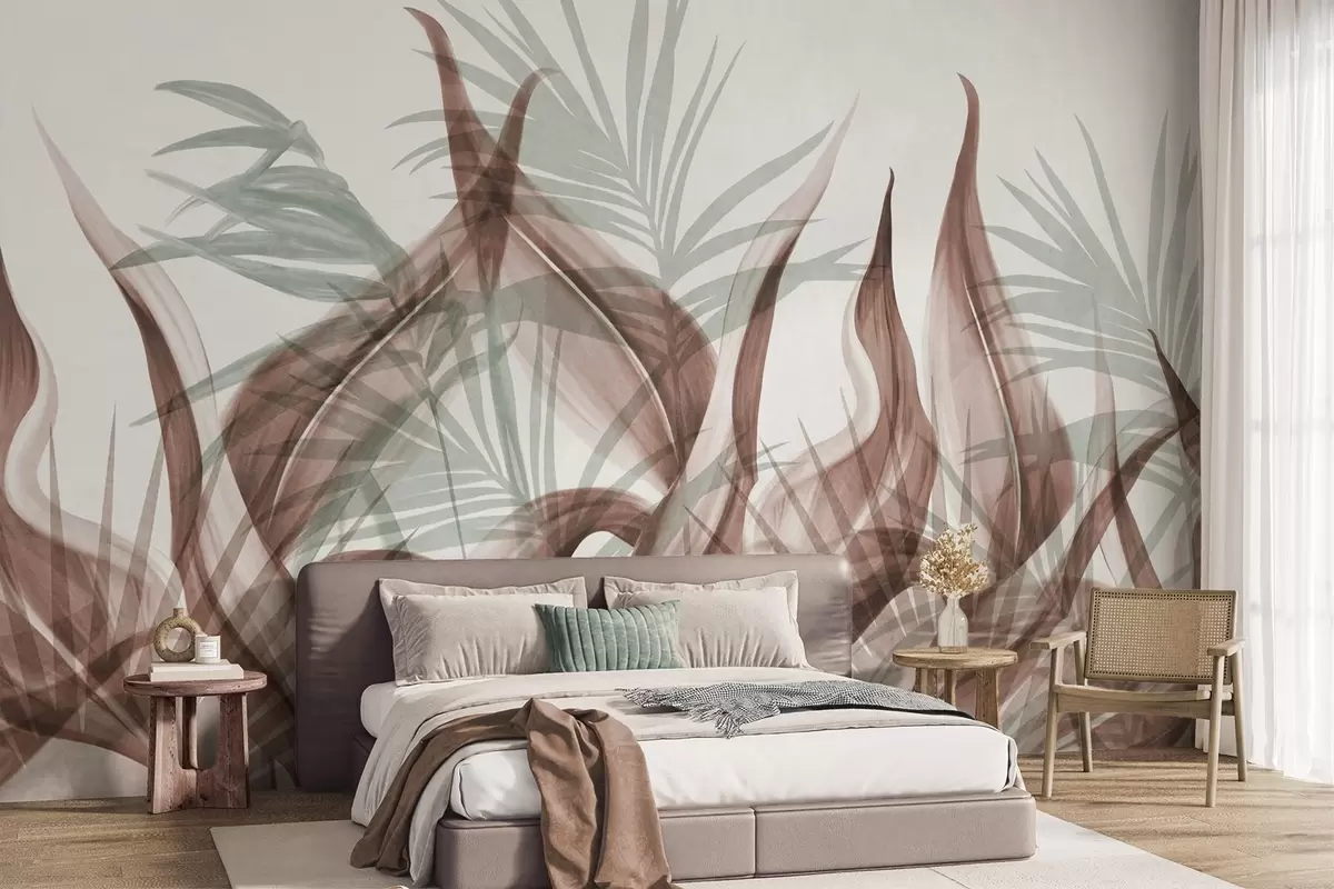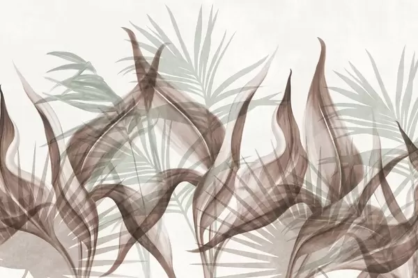 Fototapety Tropické listy v odtieňoch hnedej a zelenej na bielom pozadí, textúrovaný akvarelový štýl Nr. w09772