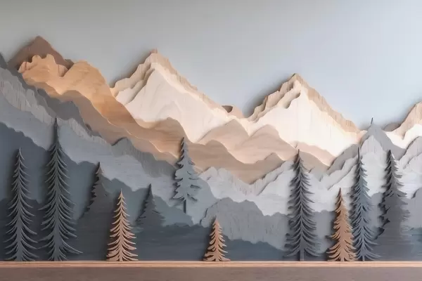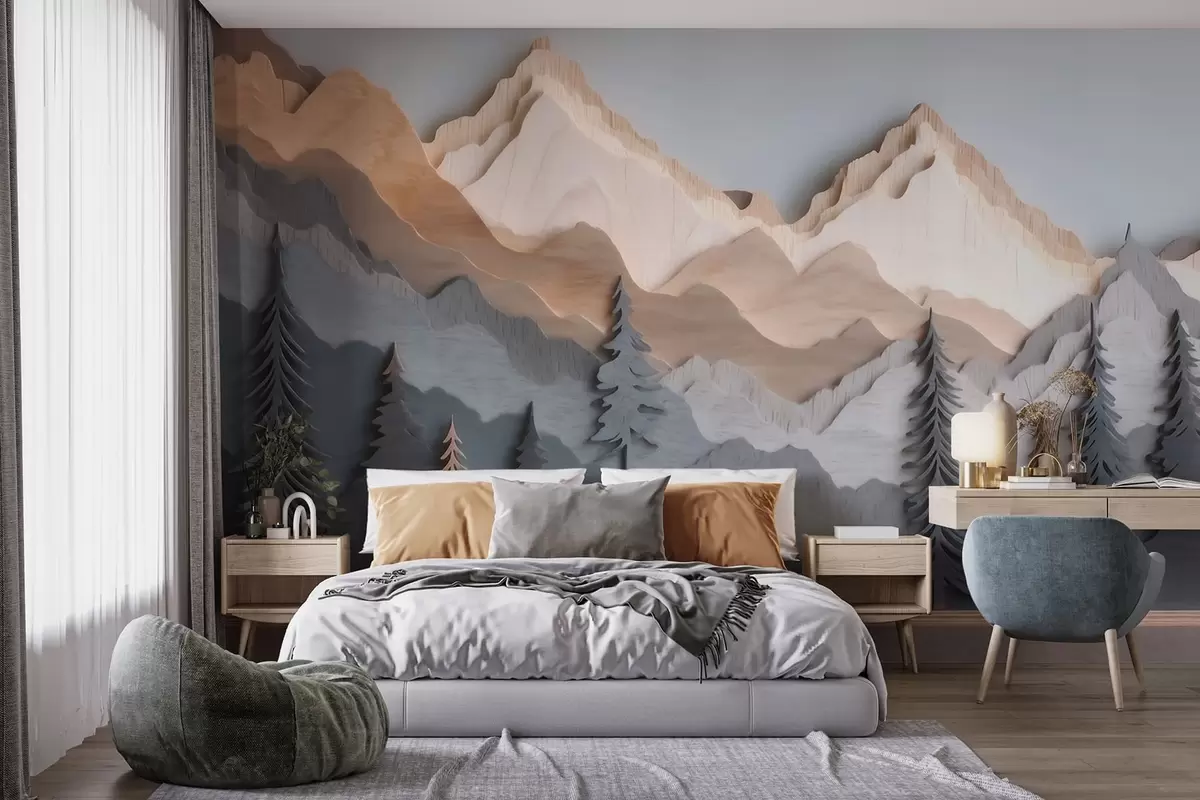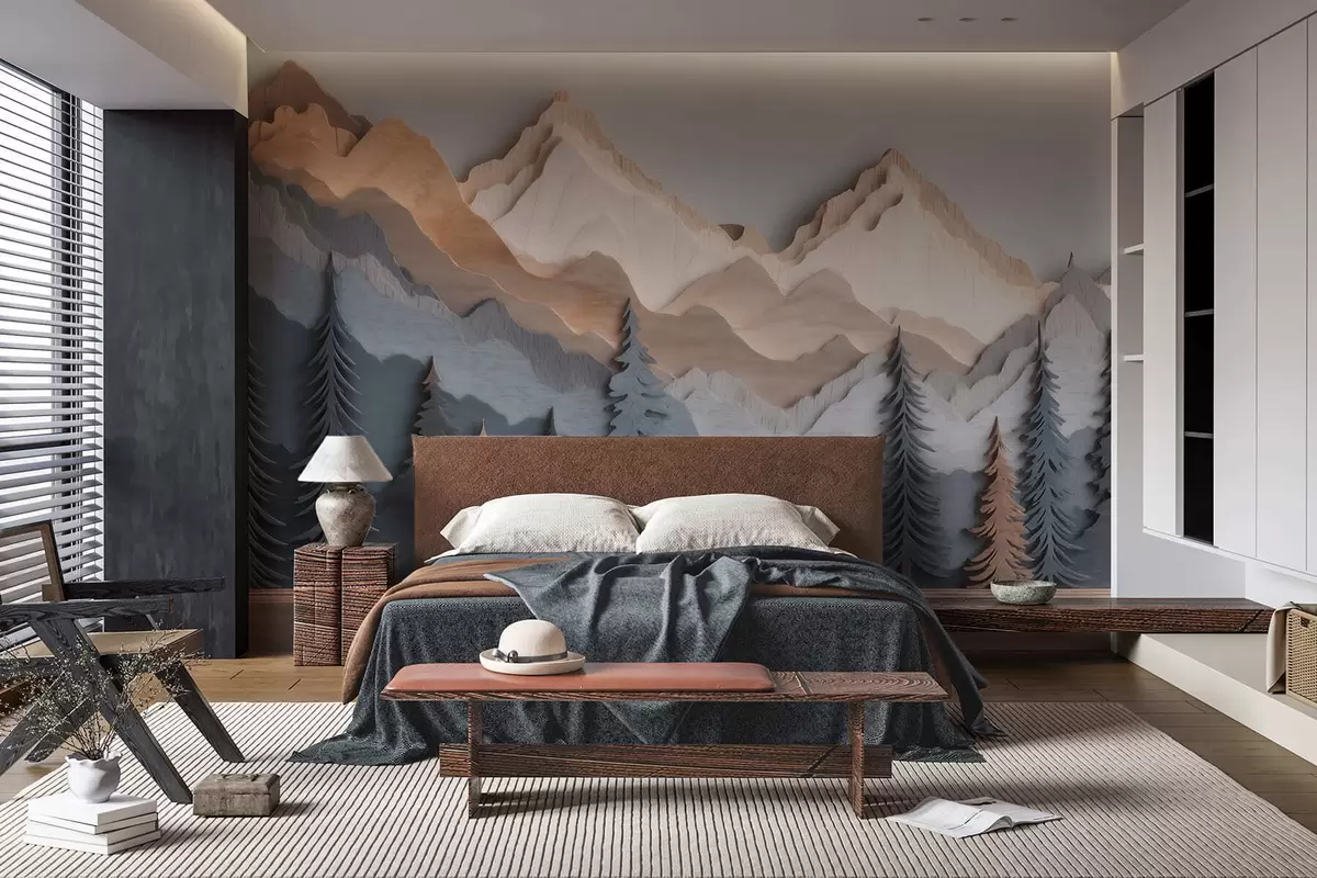 Fototapety Prírodná krajina s borovicami a horami v štýle vyrezávaného dreva Nr. w09793