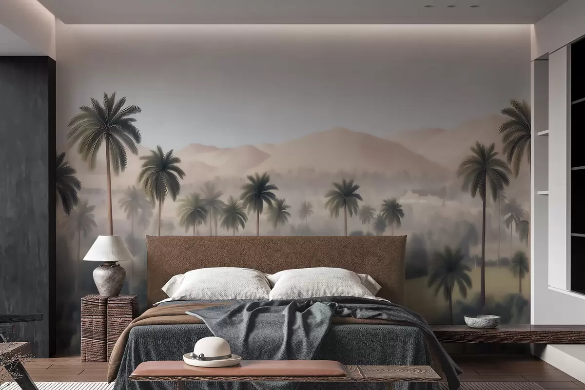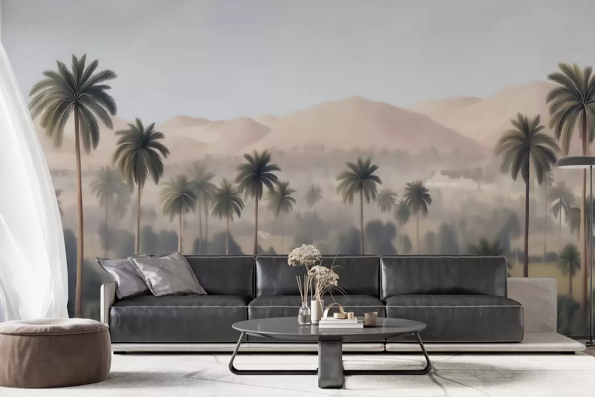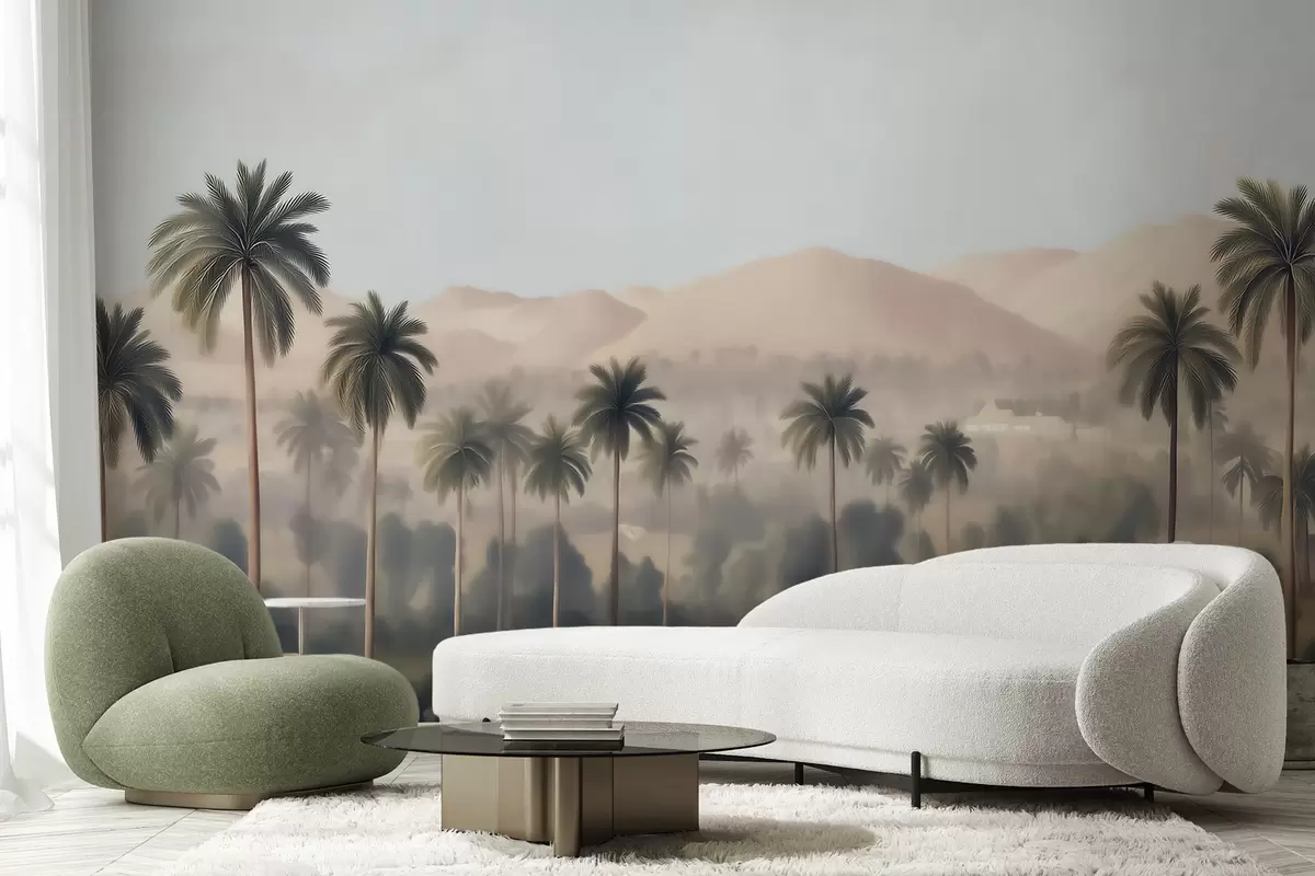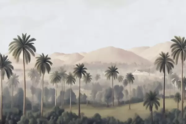 Fototapety Tropická krajina s palmami a horami, retro panoráma v béžových a zelených odtieňoch Nr. w09798