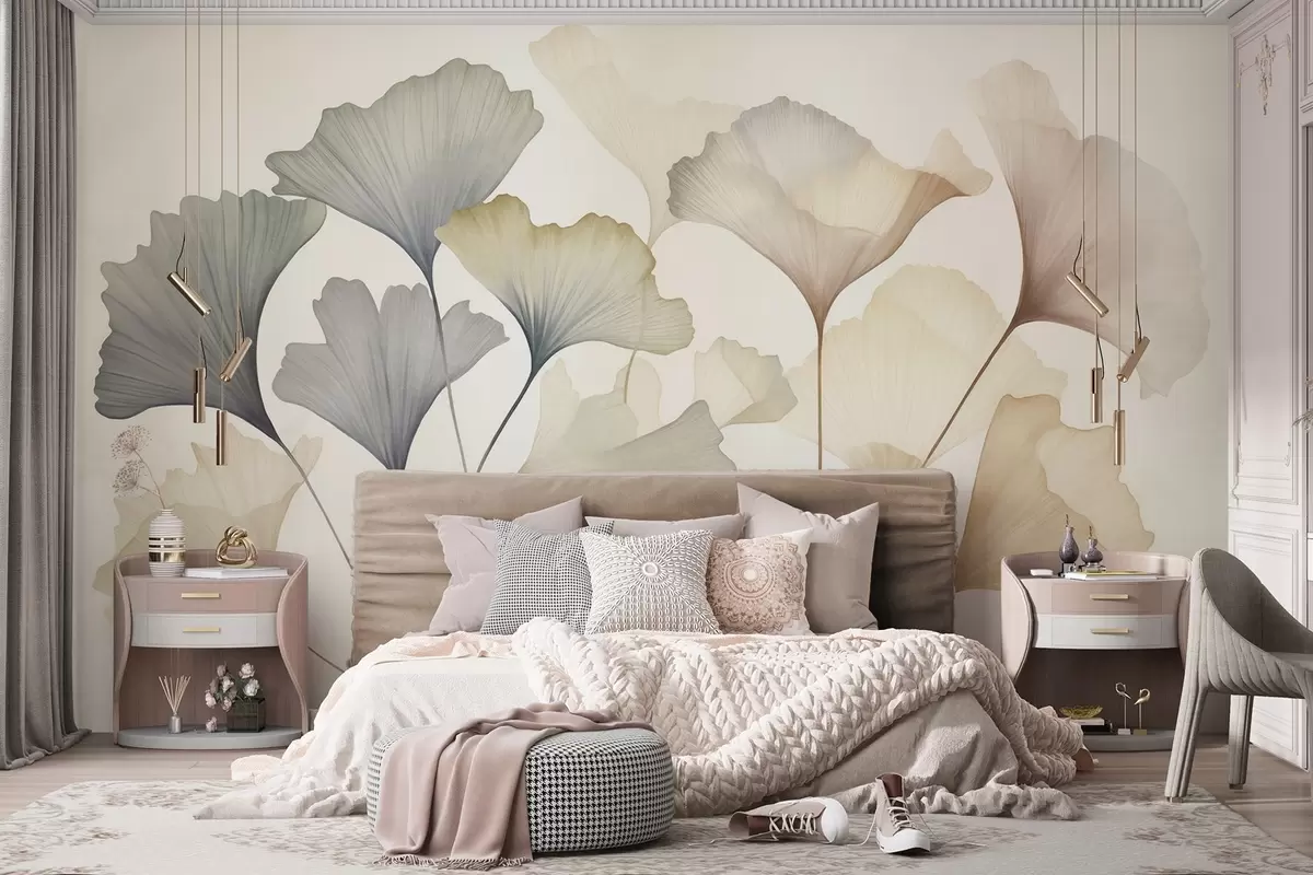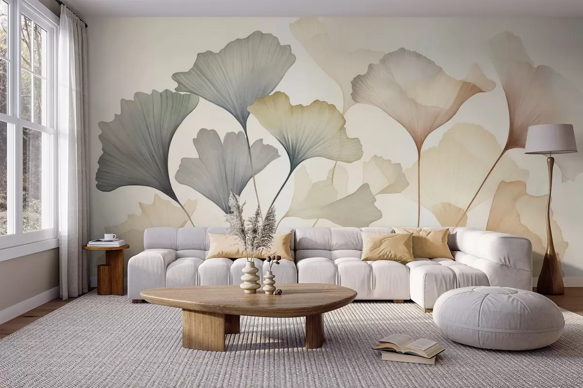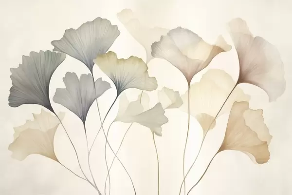 Fototapety Abstraktné listy ginkga v jemných pastelových farbách, ako je modrá, zelená a broskyňová, textúrované umelecké dielo Nr. w09810