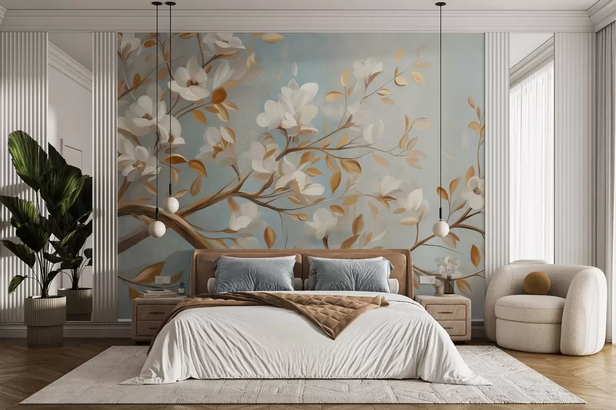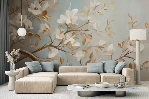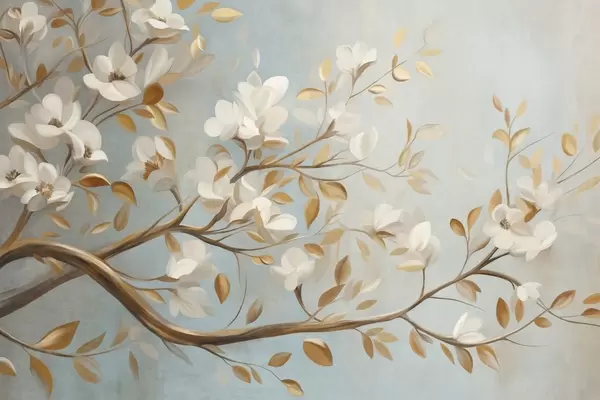 Fototapety Textúrovaná vetvička stromu s bielymi kvetmi a žltými listami, v retro štýle Nr. w09814
