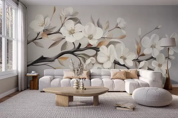 Fototapety Textúrovaná vetvička s bielymi kvetmi a hnedými listami na svetlosivom pozadí Nr. w09817