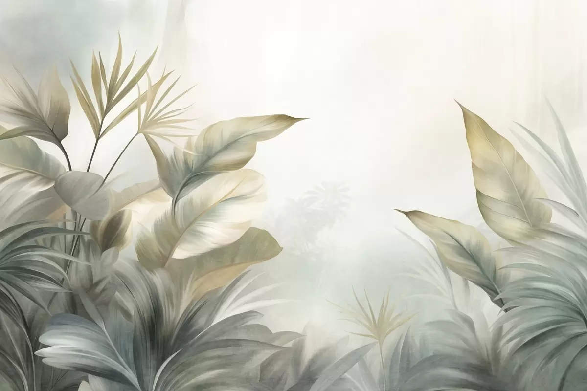 Fototapety Veľké, štruktúrované tropické listy v tlmených zelených a béžových odtieňoch, prostredie džungle Nr. w09820