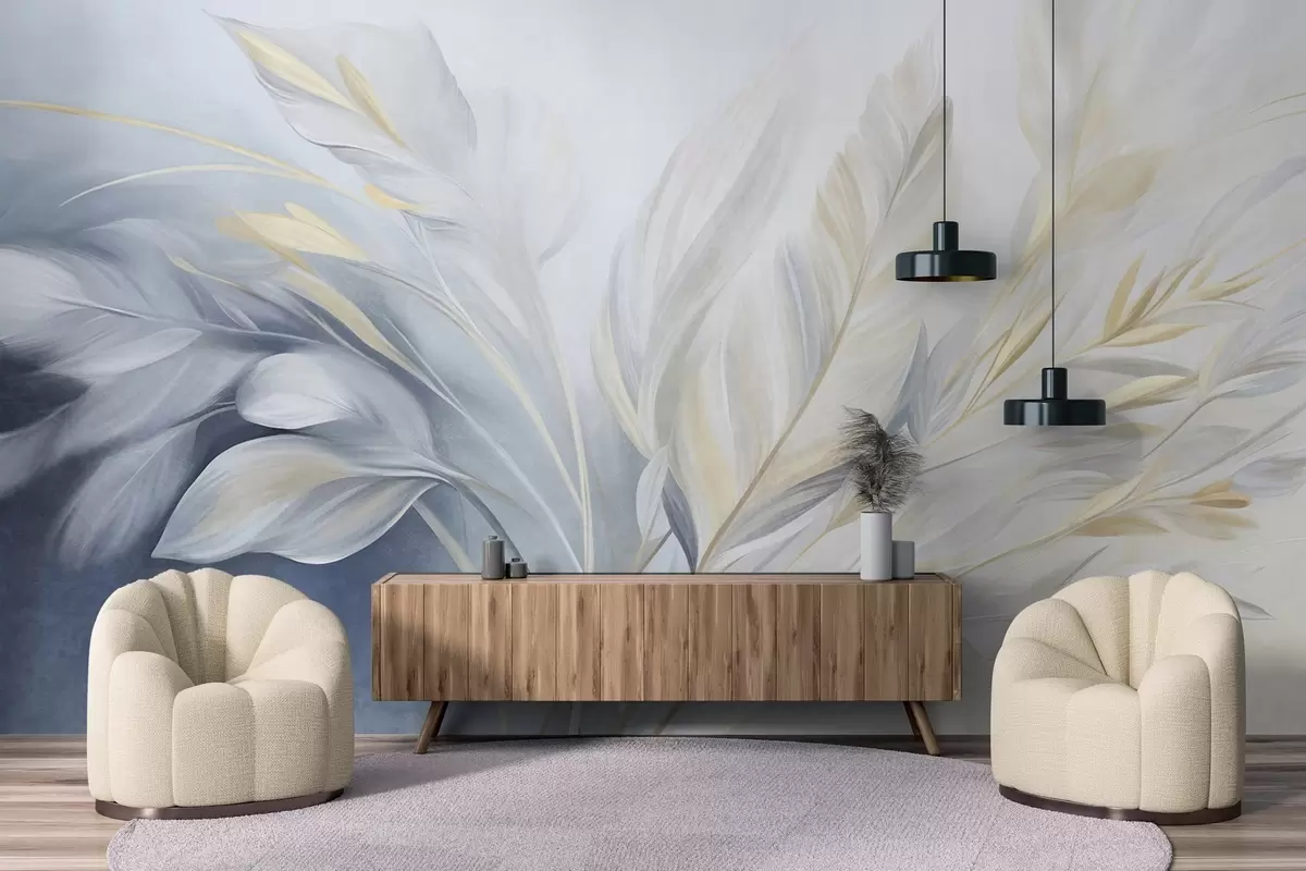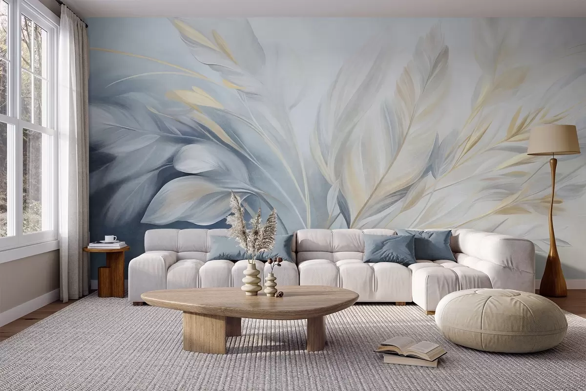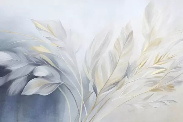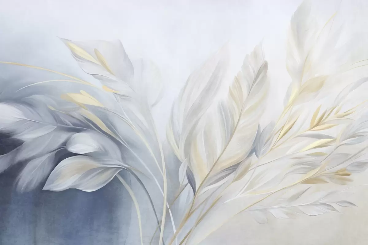 Fototapety Textúrované pierka so žltými akcentmi na jemnom pozadí bledomodrej a bielej farby Nr. w09826