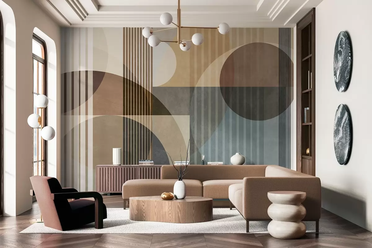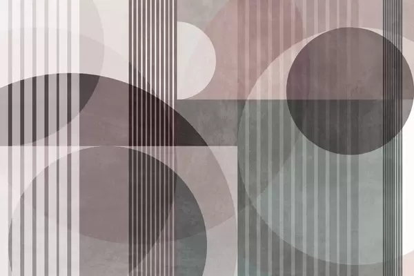Fototapety Abstraktné geometrické tvary s kruhmi a čiarami, tlmené zemité odtiene, textúrovaná, vrstvená kompozícia Nr. w09834