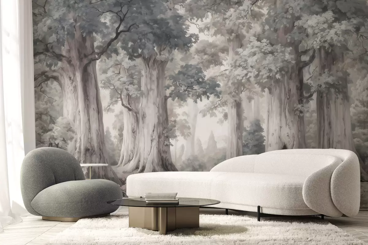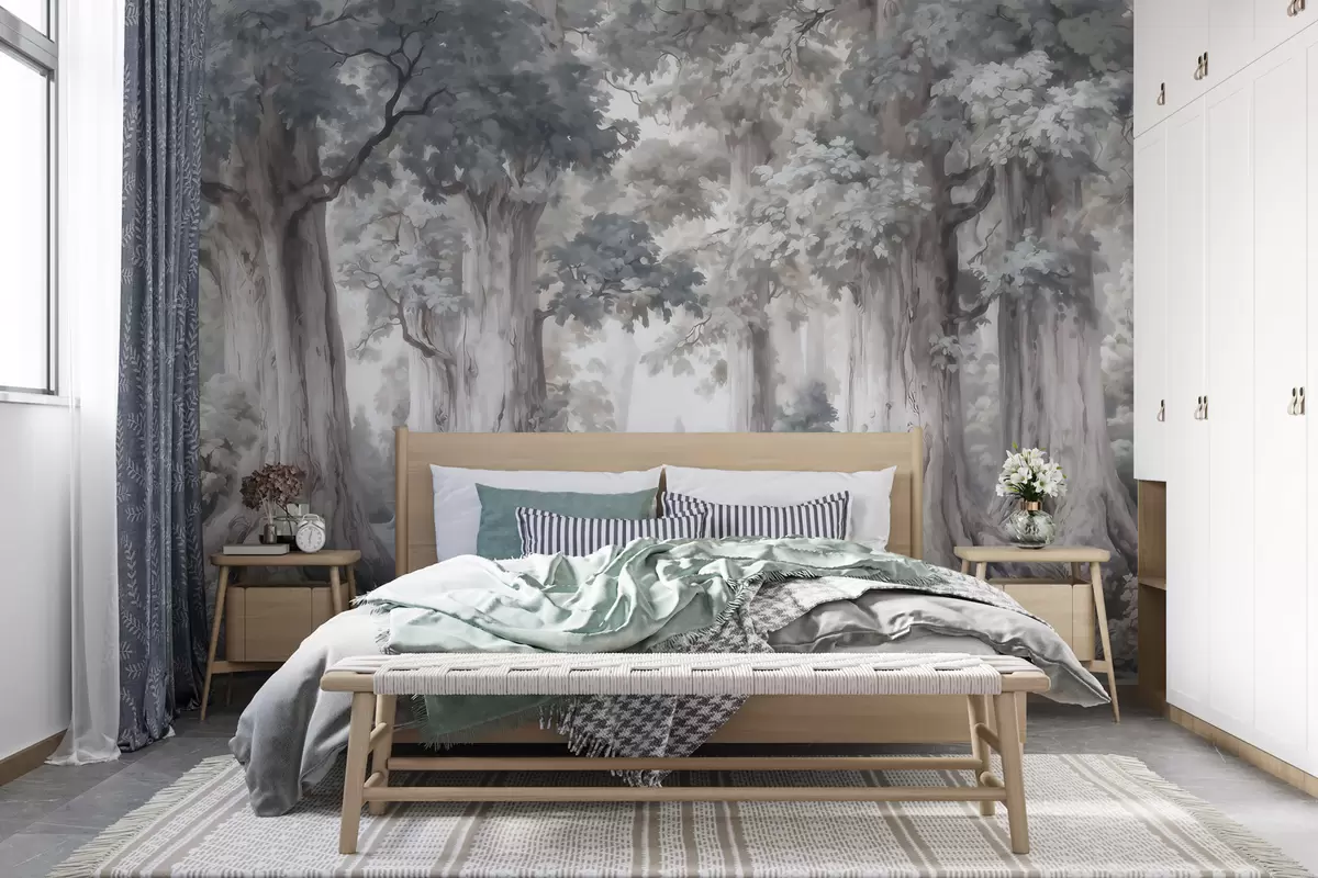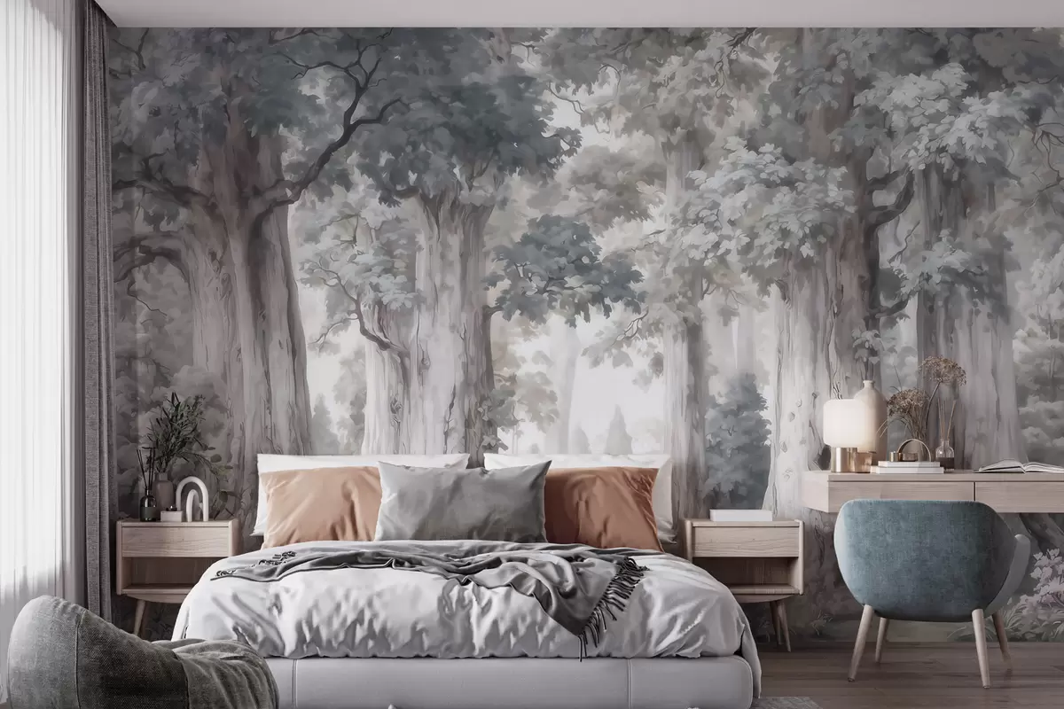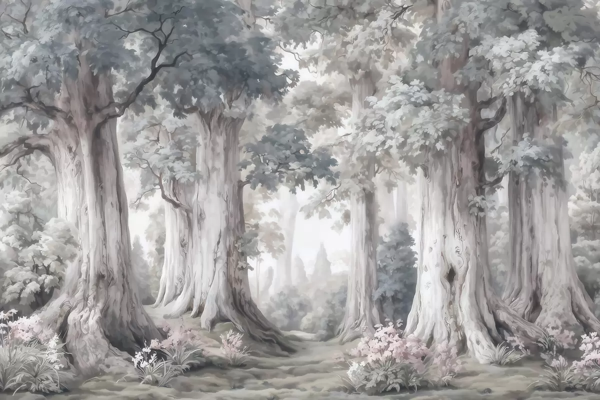 Fototapety Rozprávkový les s vysokými stromami a jemnou tlmenou farebnou škálou v akvarelovom štýle Nr. w09849