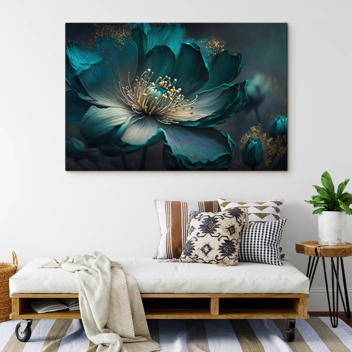 Obraz Detailný záber na rozkvitnuté záhony tyrkysových kvetov na tmavom pozadí Nr. s34854
