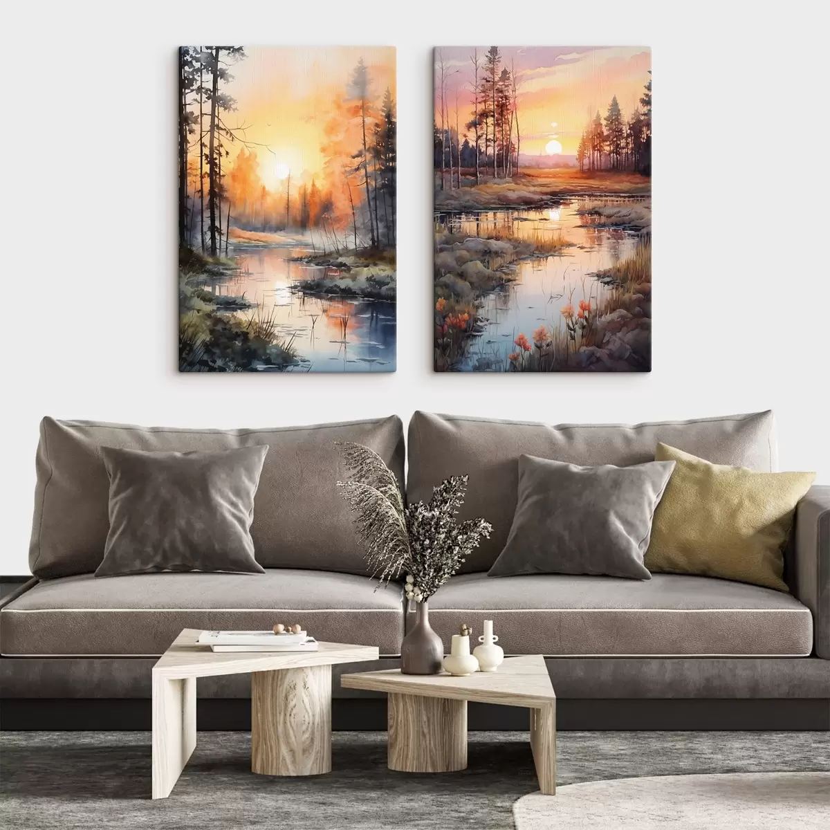 Obraz Krásna rieka v jesennom lese, akvarel, hmlistá, obloha pri západe slnka Nr. m00383