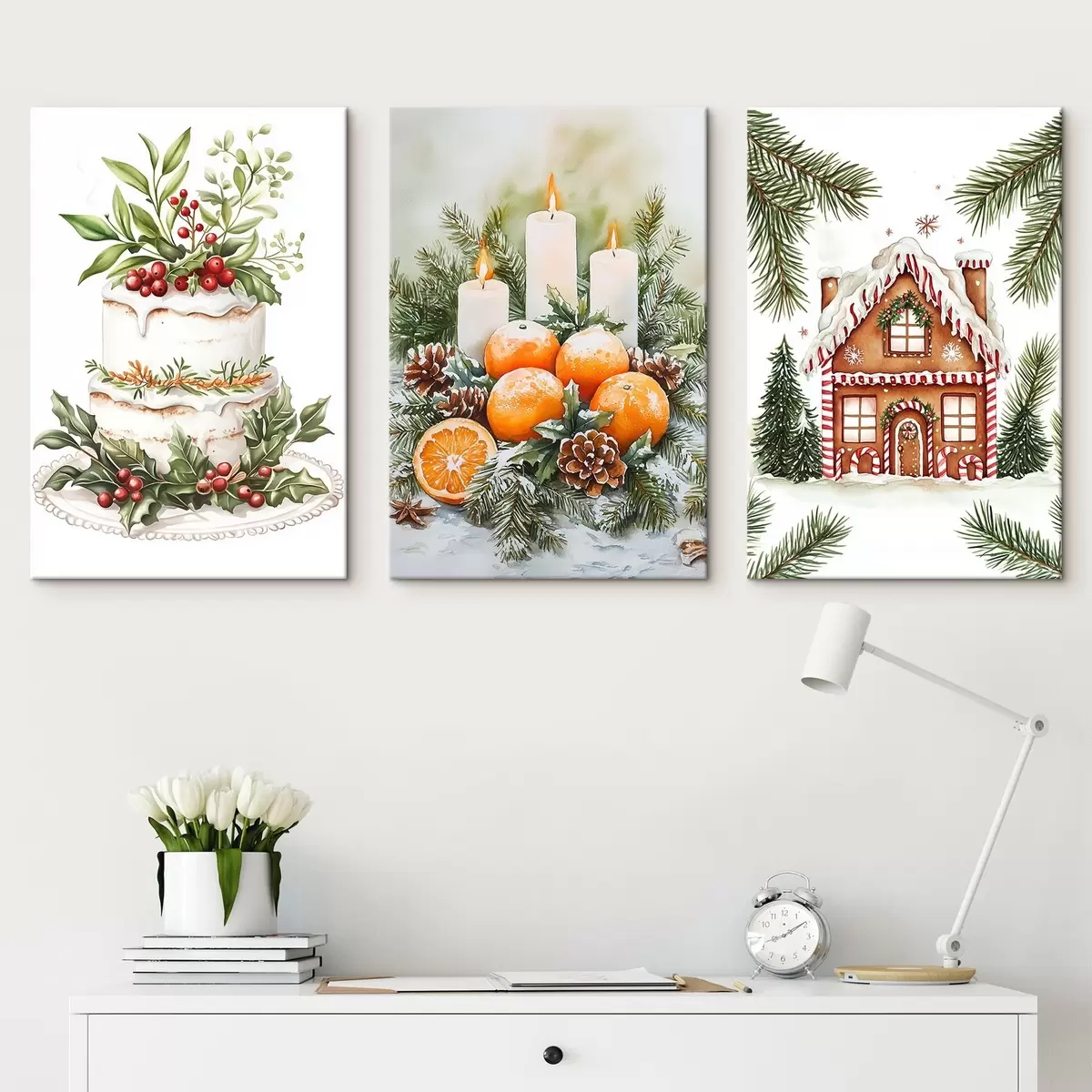 Obraz Vianočné ozdoby, rýchly koláč, perník, pomaranče a sviečky, akvarelový štýl Nr. m00385