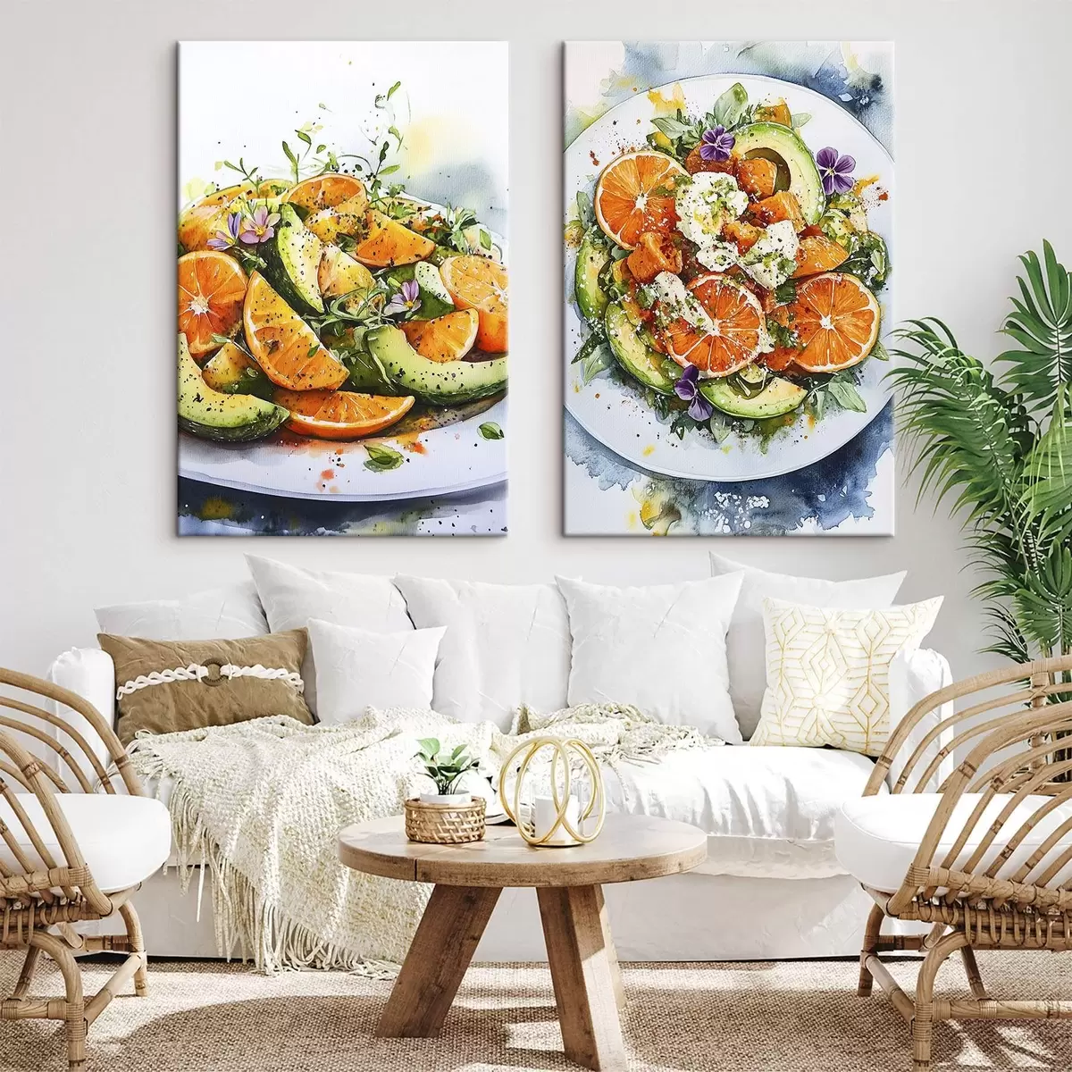 Obraz Lahodný slávnostný šalát s pomarančmi, syrom feta, tekvicou a avokádom, akvarelové potraviny Nr. m00388
