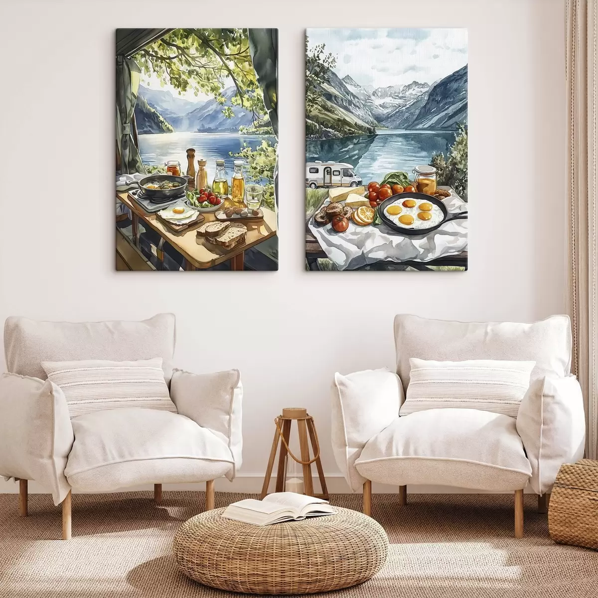 Obraz Kempovanie, estetické raňajky pri jazere, akvarel Nr. m00405