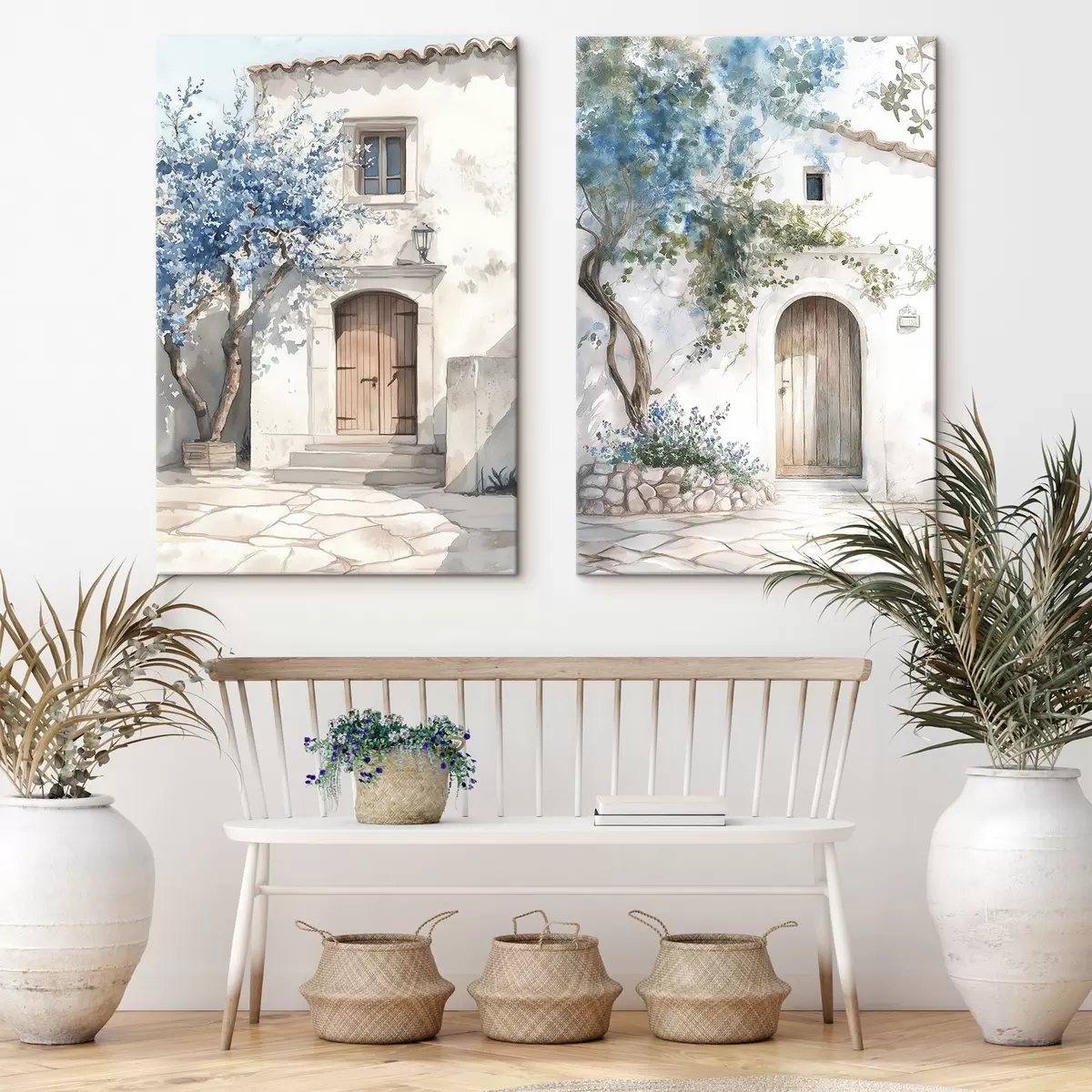 Obraz Grécke biele domy s kvitnúcimi stromami, stredomorské, akvarelový štýl kresby Nr. m00419