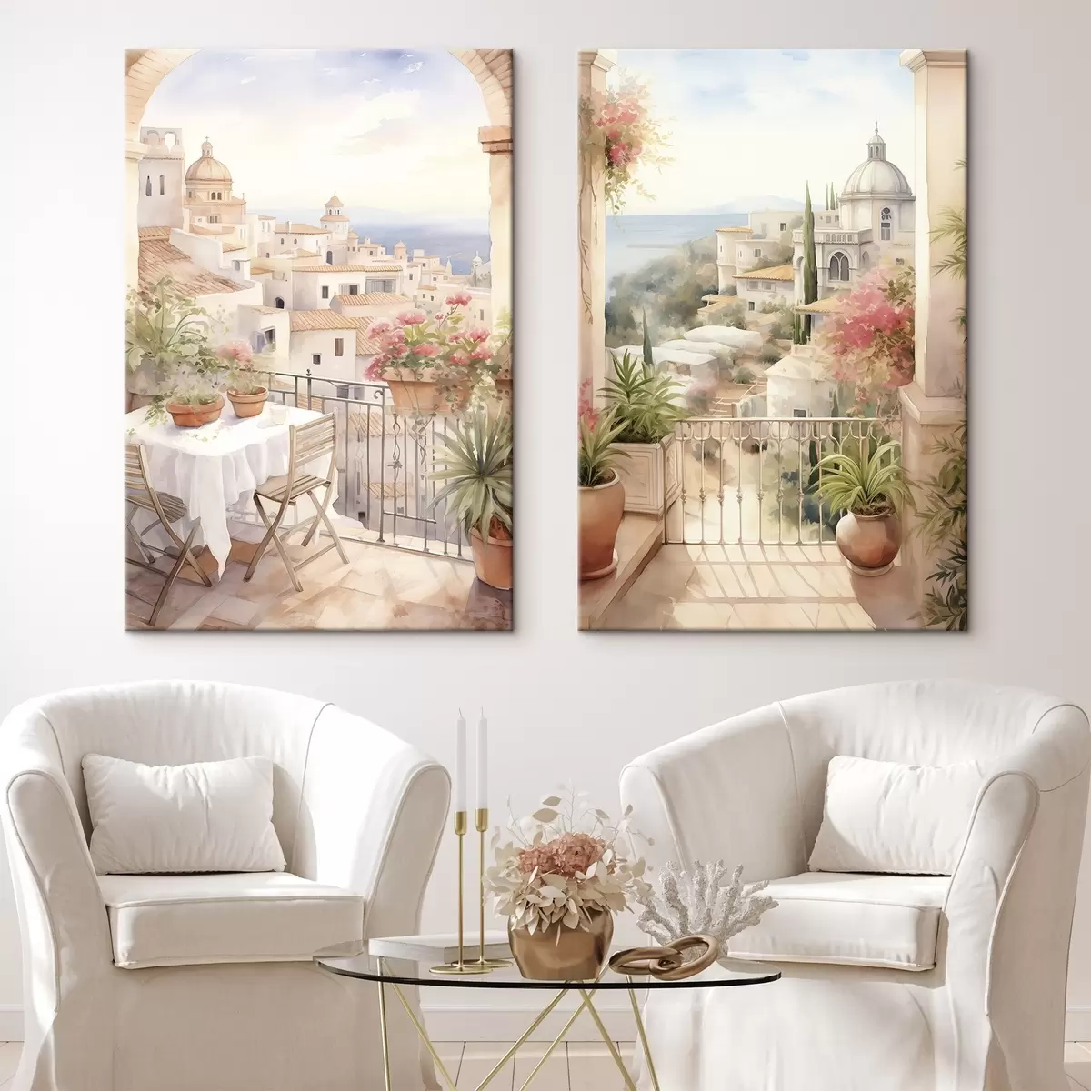 Obraz Západ slnka na balkóne, architektúra, kvitnúce kvety, akvarel, stredomorský štýl Nr. m00420
