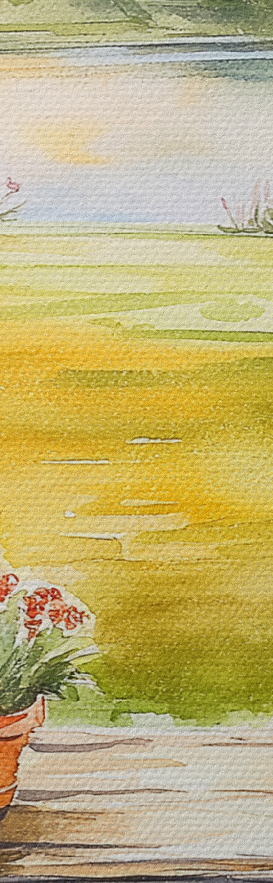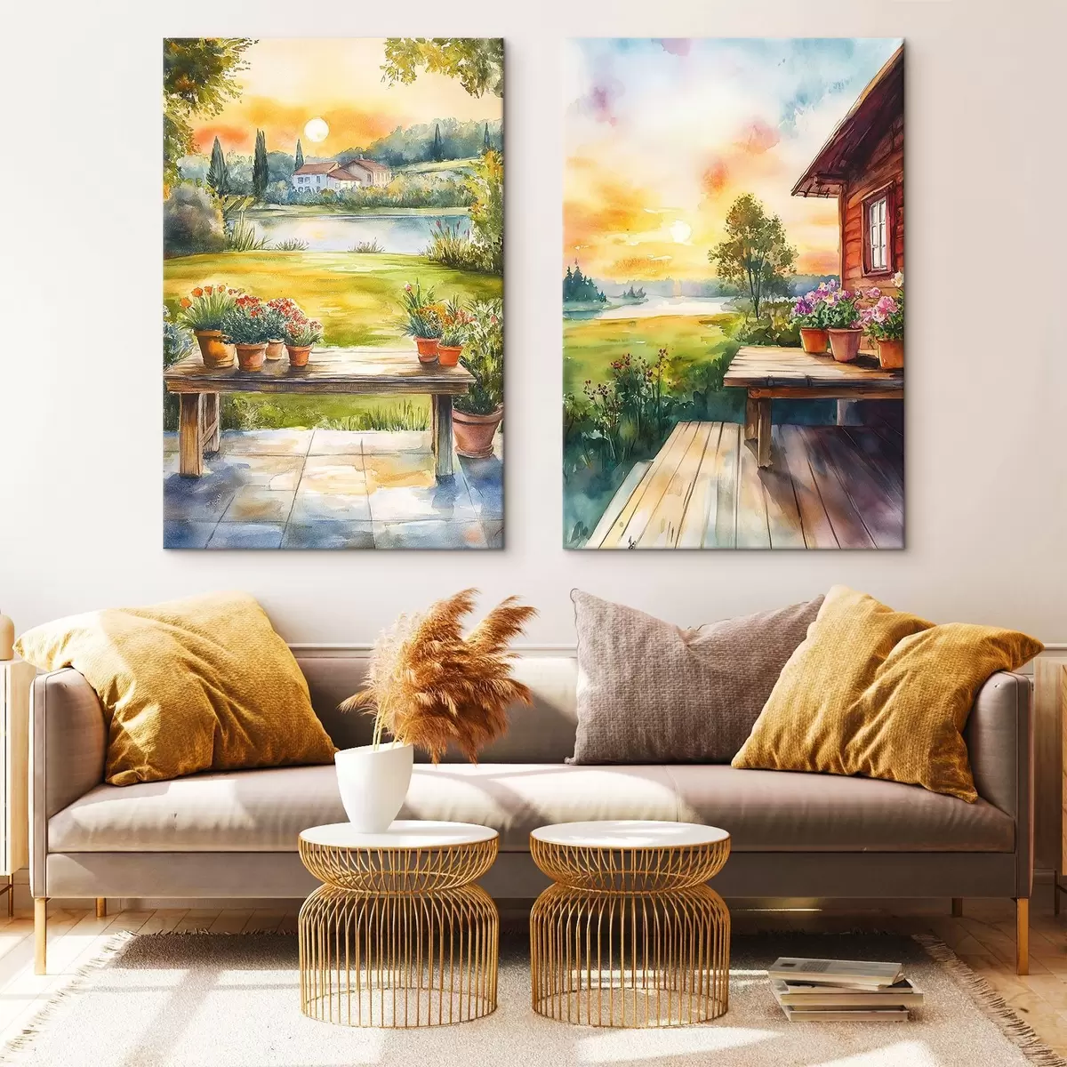 Obraz Letná dedina, západ slnka, rustikálne, kvety, jazero, akvarel Nr. m00449