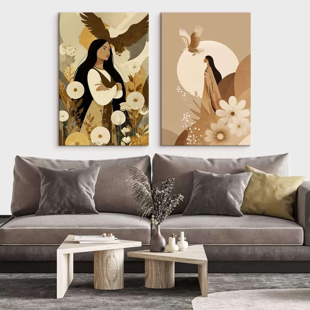 Obraz Ženy s lietajúcimi orlami, kmeňový štýl, béžové farby Nr. m00477