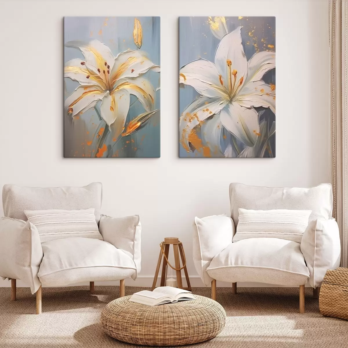 Obraz Biele ľalie so žltými ťahmi na modrom pozadí Nr. m00497