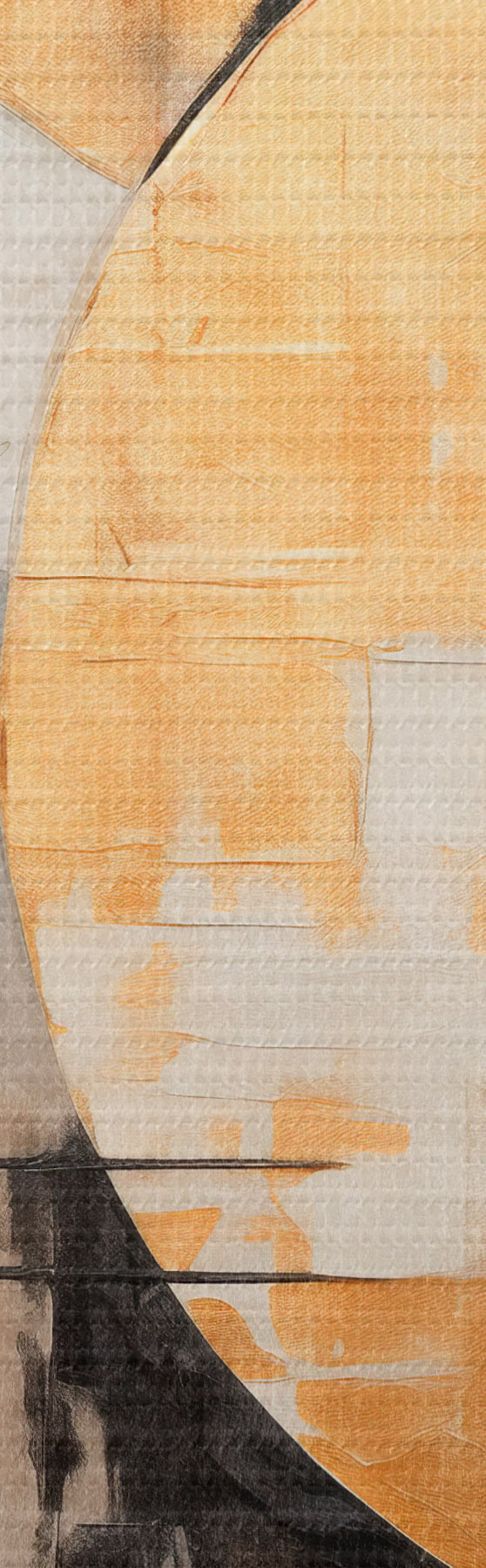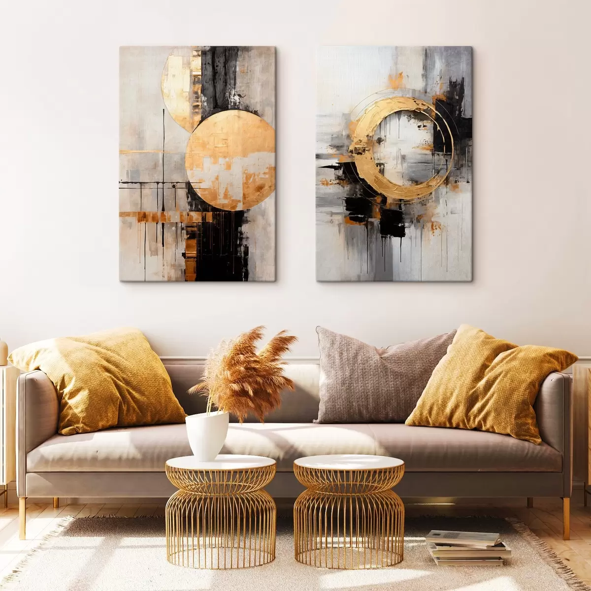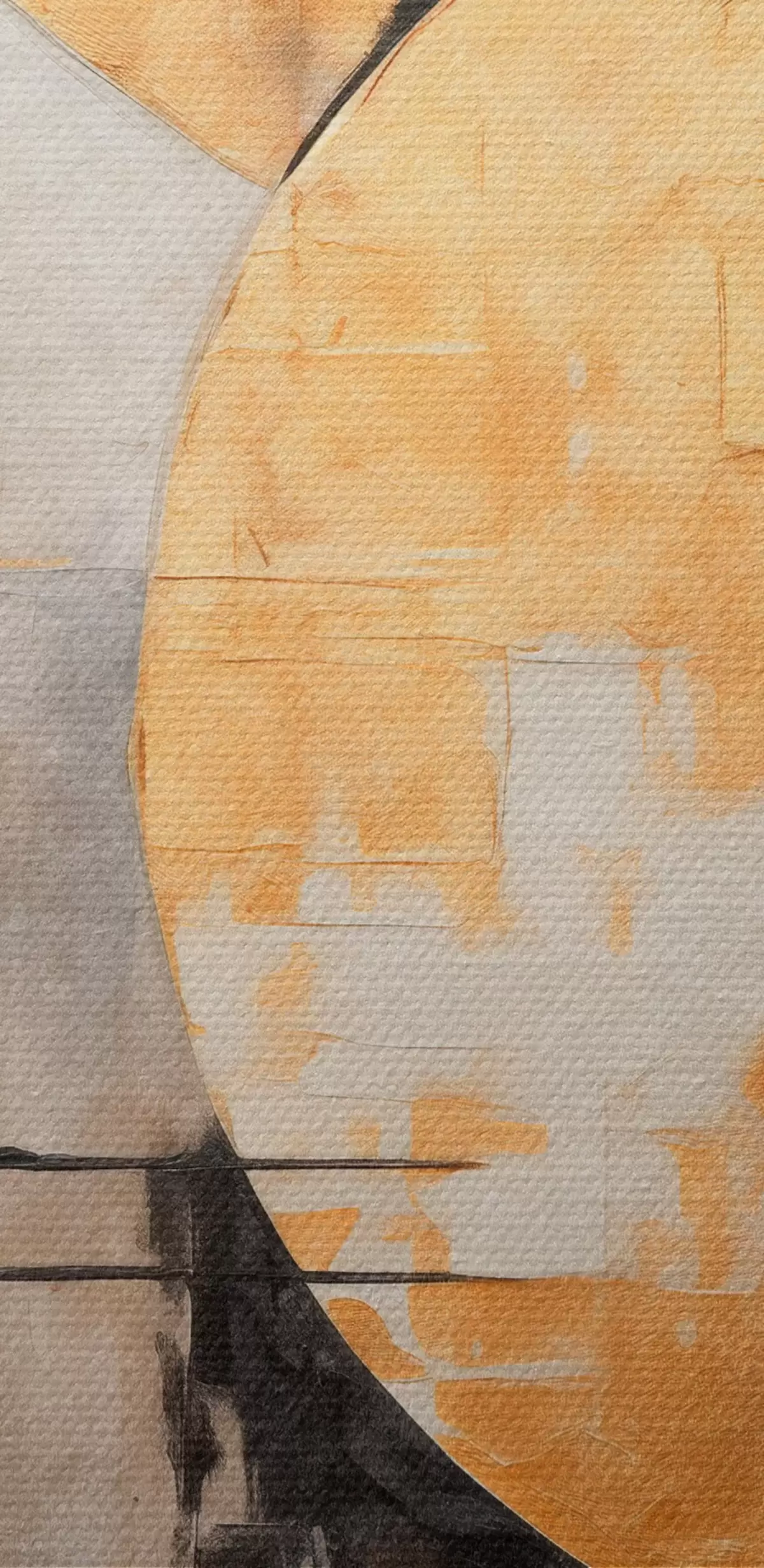Obraz Abstraktná maľba s kruhmi, čiernymi a žltými čiarami a pozadím so sivými a bielymi tónmi Nr. m00527